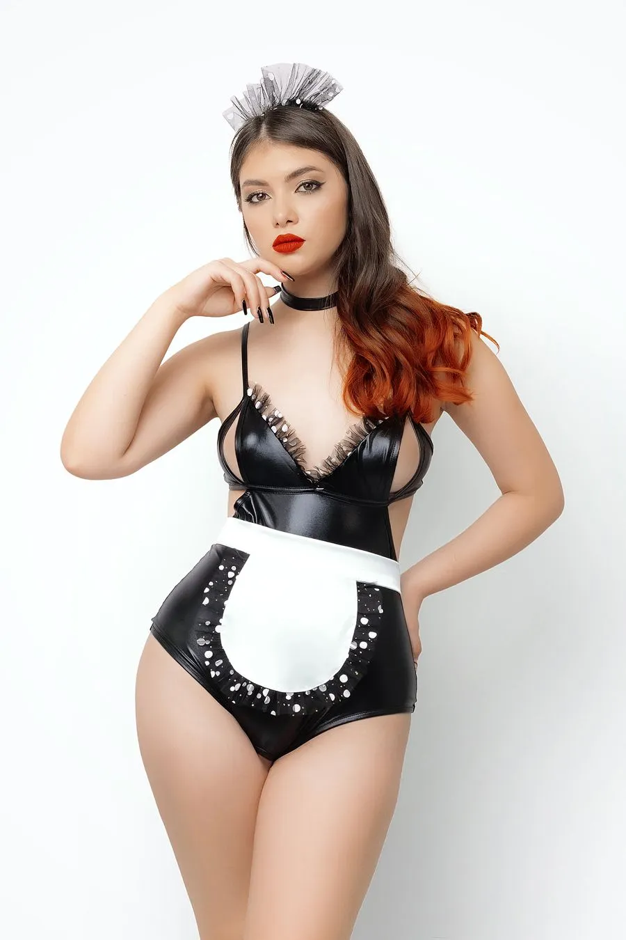 Облегающее боди подчеркивает талию и открывает ягодицы. Лиф с откровенным декольте и вырезами обнажает чувствительные зоны, а регулируемые бретели и двухрядная застежка на спине слегка поддерживают грудь. Эластичный трикотажный материал с напылением wetlook соблазнительно выглядит, приятен на ощупь, комфортен в носке. Дизайн модели скрывает животик и подчеркивает соблазнительные объемы. Минималистичный чокер на кнопке привлекает внимание к ключицам и гладкой коже. Атласный фартук с длинными завязками подчеркивает талию, притягивает внимание наблюдателя к попе и вносит элемент игры во время показа. Головной убор завершает образ.