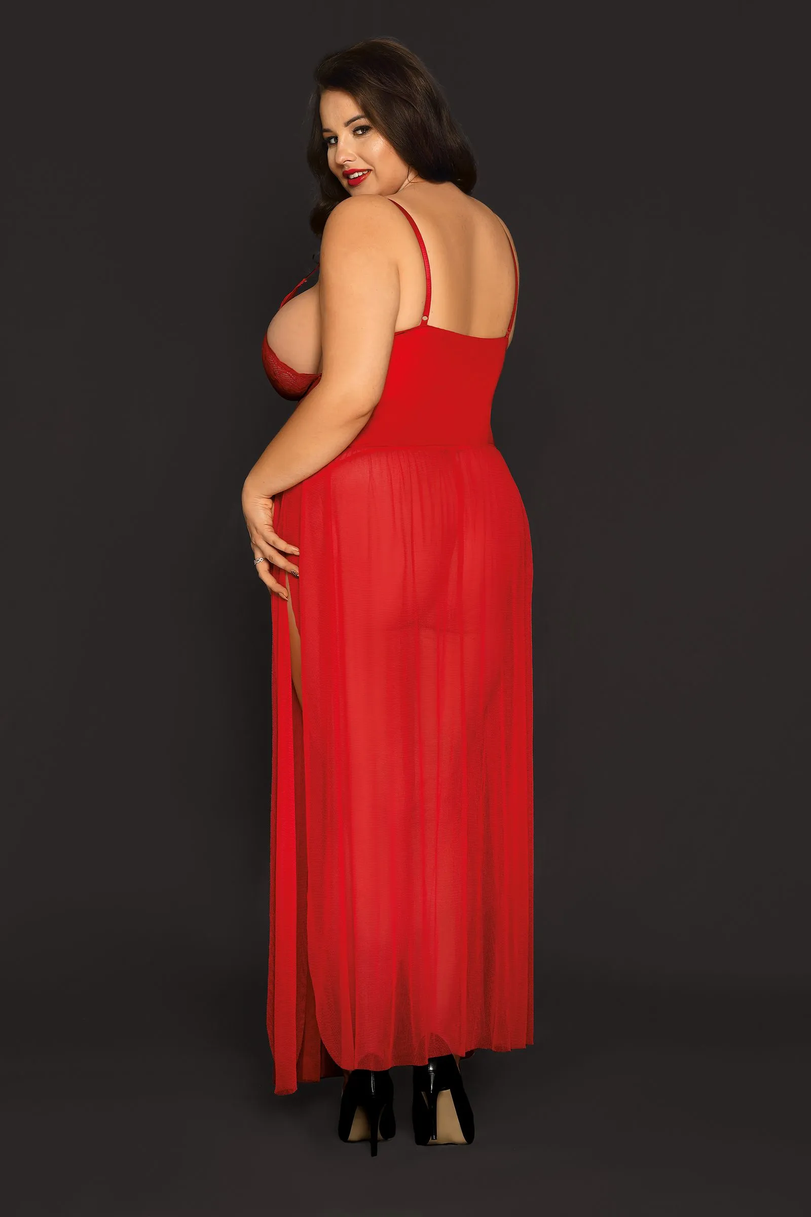 Длинная комбинация и Т-стринги Candy Girl® Tabitha создают wow-эффект. Кружевной лиф визуально добавляет объем и поддерживает грудь. Вставки из трикотажной ткани и лаковой кожи плотно обхватывают талию, создавая точеный силуэт, а шнуровка и регулируемые бретели помогают достичь комфортной посадки. Четыре высоких продольных разреза струящейся юбки из полупрозрачной сетки зрительно удлиняют ноги и соблазнительно приоткрывают колени, бедра и ягодицы. Комбинация для дивы с шикарными формами идеальна для танца, романтического вечера или в качестве домашнего наряда.