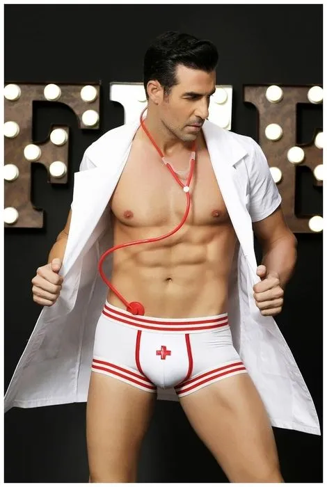 Плотный непрозрачный халат с отложным воротником, накладными карманами, короткими рукавами, контрастной отделкой и значком-бейджем, куда легко вписать имя. Слегка приталенный силуэт халата добавит стройности фигуре. Эластичные боксеры с контрастной отделкой, на широких резинках. Пластиковый стетоскоп входит в комплект. Вы можете фантазировать и добавлять любые аксессуары под настроение.