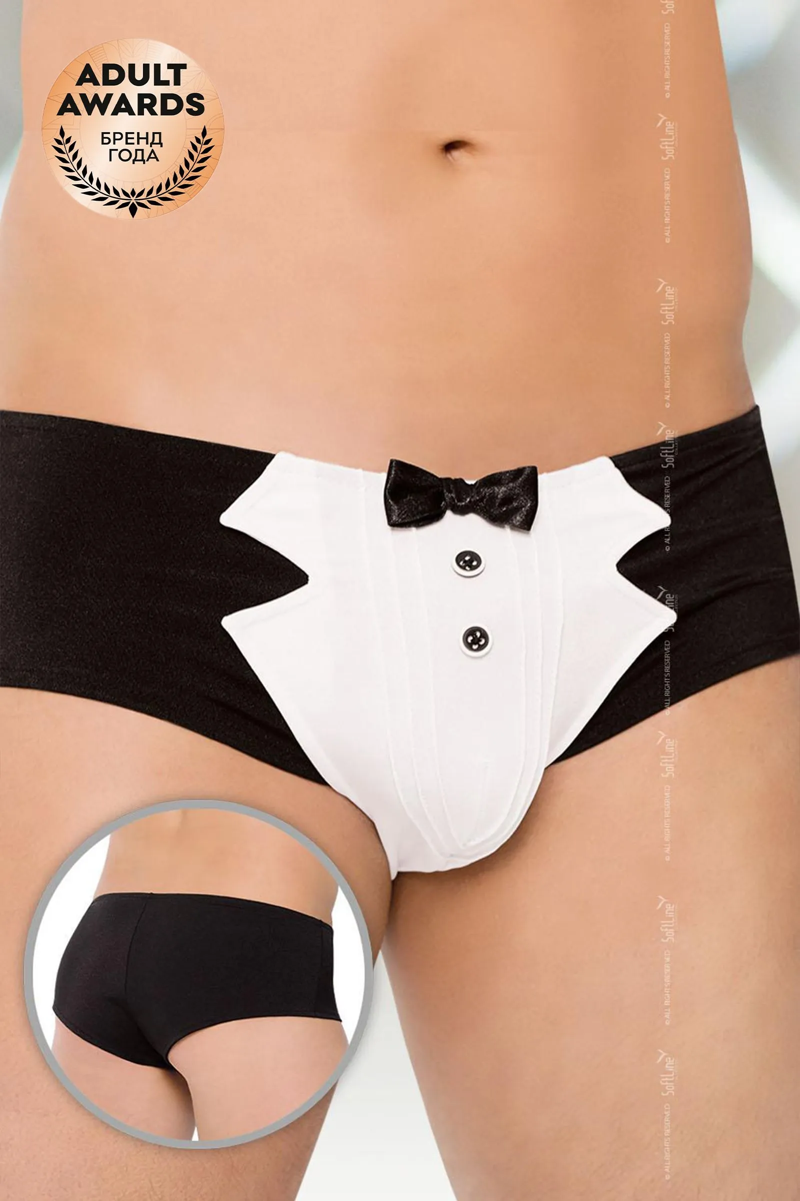 Трусы-шорты из плотной черной ткани. Спереди по центру вставка из белой плотной ткани, украшенная парой декоративных пуговиц и галстуком-"бабочка" (иммитация костюма официанта). Трусы предназначены для ролевых игр.