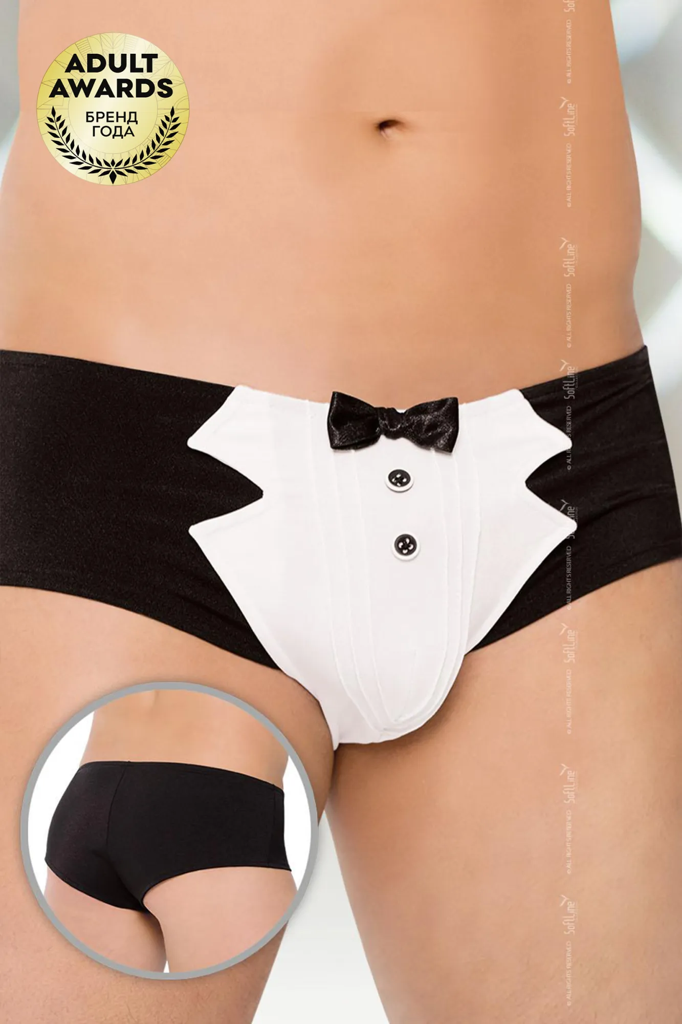 Трусы-шорты из плотной черной ткани. Спереди по центру вставка из белой плотной ткани, украшенная парой декоративных пуговиц и галстуком-"бабочка" (иммитация костюма официанта). Трусы предназначены для ролевых игр.