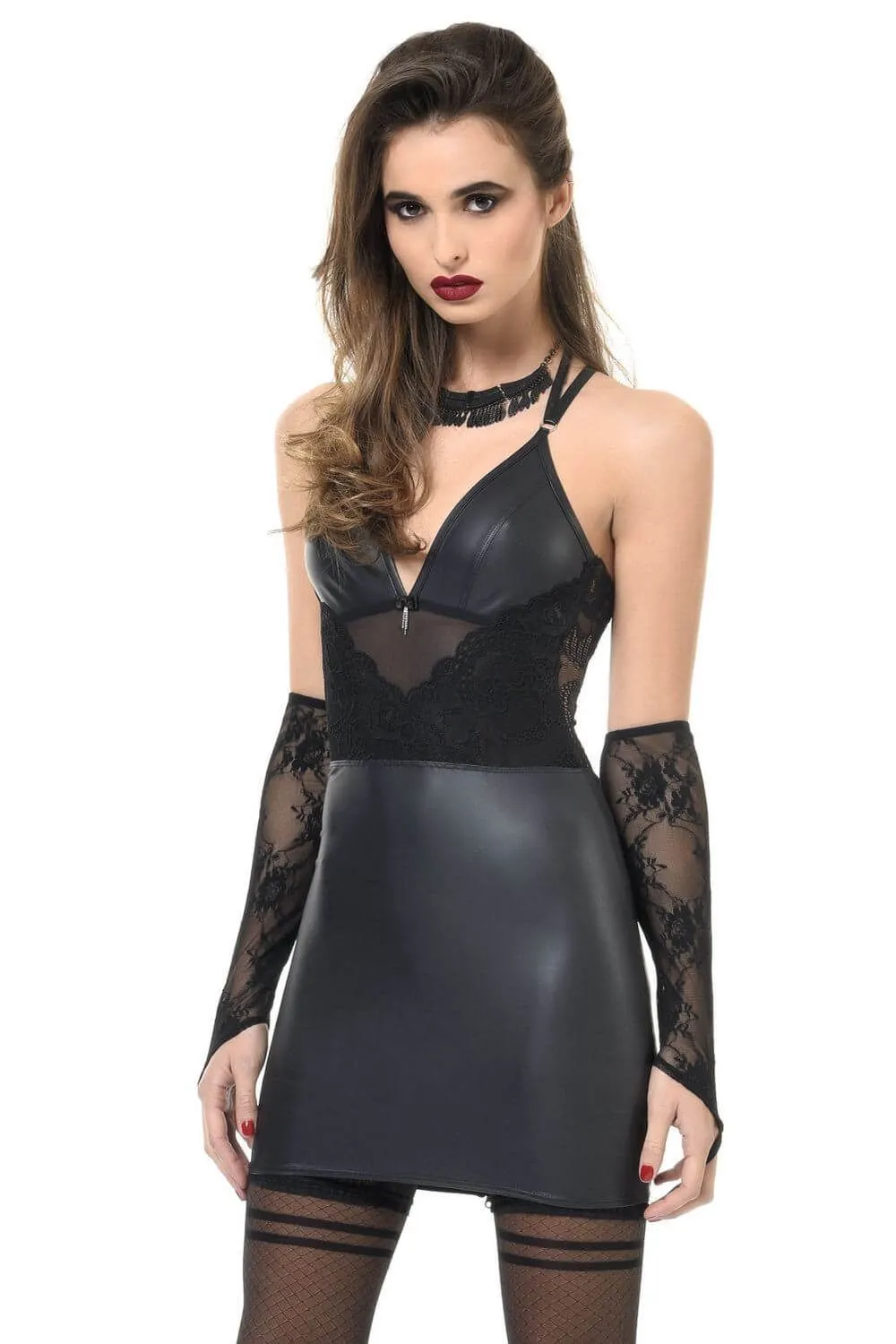 Элегантное платье Lydia из коллекции Tome 14.2 от французского модельера Patrice Catanzaro выполнено из сочетания плотного черного материала, имитирующего мокрую кожу, и полупрозрачного кружева с цветочным мотивом. Короткое платье будет плотно облегать фигуру, волнительно очерчивая все ее соблазнительные изгибы. Вырез в области декольте украшен небольшим пикантным бантиком с подвеской. Сзади платье застегивается на молнию и крючки. Бретельки регулируются.