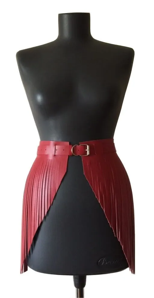 Юбка с бахромой выполнена из натуральной кожи красного цвета. Ремень съемный. Обхват талии от 60 до 89 см. Максимальная длина: 40 см.