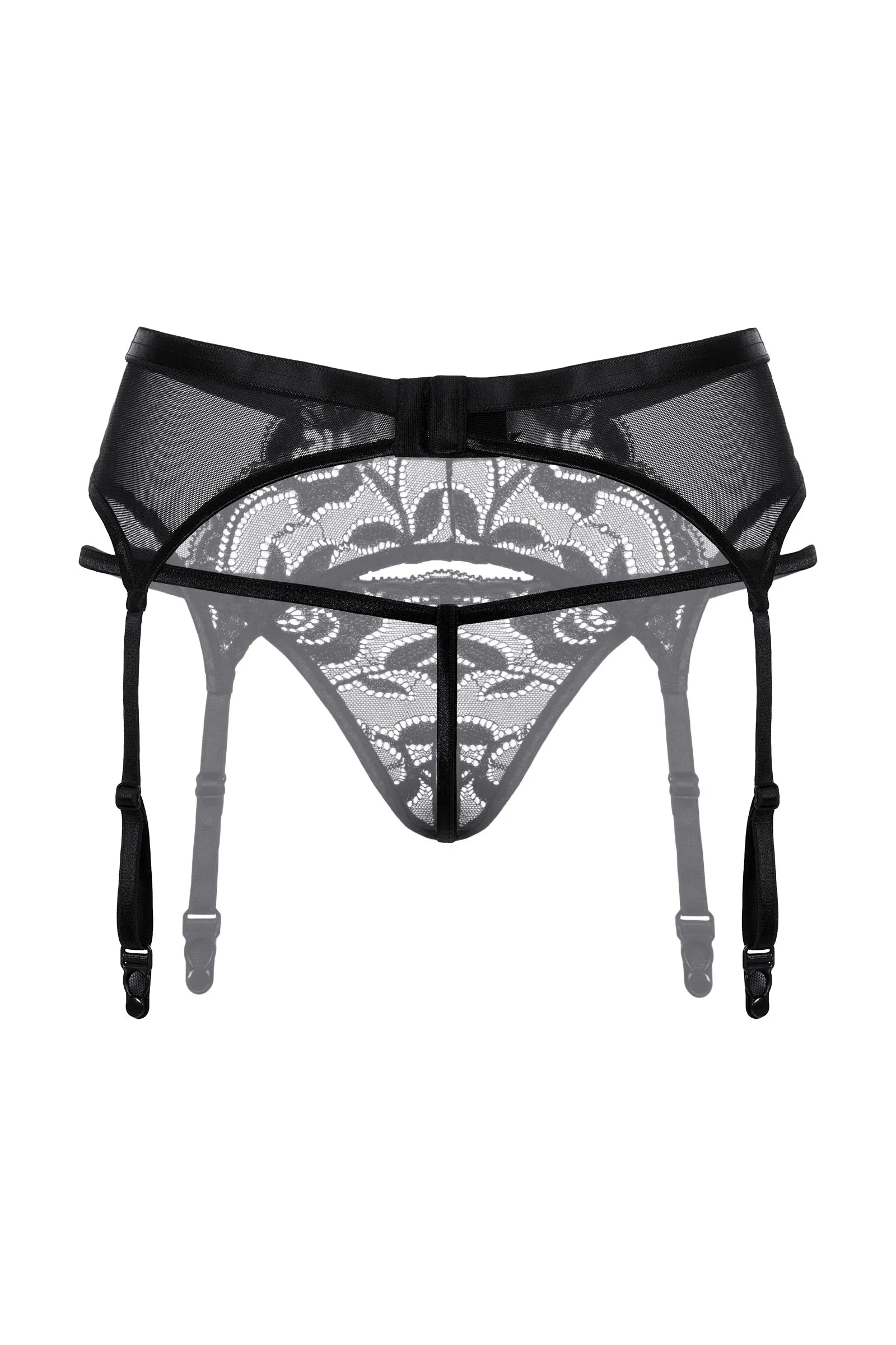 Пояс для чулок и стринги, выполненные из тонкой сетки, спереди украшенные кружевными вставками. Застежка пояса сзади. Т-стринги с вырезом в интимной зоне.