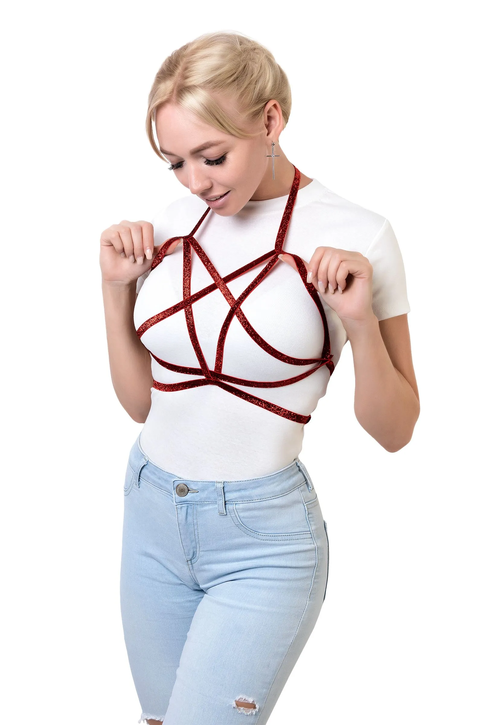 Стрепы - уникальный аксессуар, способный добавить сексуальных акцентов не только в эротическом, но и в повседневном образе! Стреп Essie Блестящие красные ленты переплетаются в звезду в области декольте. Открытая одежда будет выгодно подчеркнута таким аксессуаром. Благодаря регулируемым ремешкам - идеальная посадка по фигуре гарантирована!