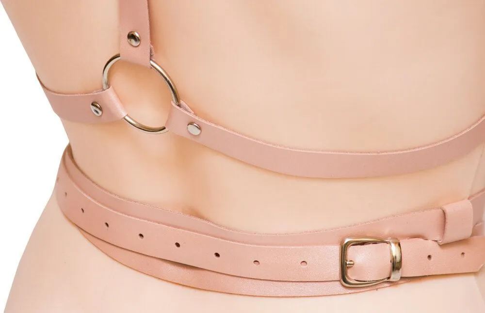 Портупея с двойным ремнем подойдет для повседневного ношения поверх одежды, а также для создания необходимого образа во время ролевых игр. Портупея выполнена из натуральной кожи светло-розового цвета, спереди ее украшает переплетение ремней с пряжками, а сзади ремни на талии накладываются один на другой. Надев данный аксессуар, Вы сможете подчеркнуть свой дерзкий стиль и раскрыть всю страстность своей натуры.