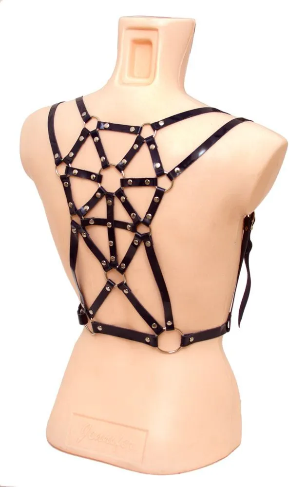 Спереди портупея выглядит достаточно просто и незатейливо, однако сзади богатое переплетение полосок кожи и металлических колец создает сложный узор в виде паутинки, завораживающий своей красотой. Ремни регулируются по длине, поэтому Вы сможете подогнать портупею под свой размер.