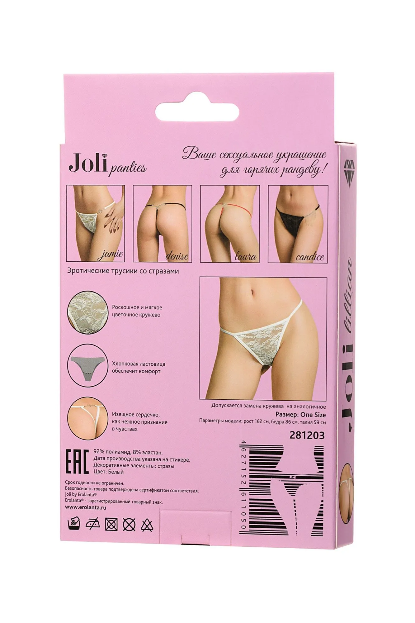 Joli panties – ваше сексуальное украшение для горячих рандеву! Новая линейка романтичного белья Joli (в пер. с французского красивая) радует глаз элегантными деталями и нежными материалами европейского качества. Миниатюрные трусики выполнены из кружева с цветочным орнаментом. Нежные и невесомые, с хлопковой ластовицей и мягкими лямками обеспечат комфорт. Нежное признание в виде изящного сердечка у основания ягодиц расскажет о ваших чувствах к партнеру. Joli panties – выбери украшение для обольщения!