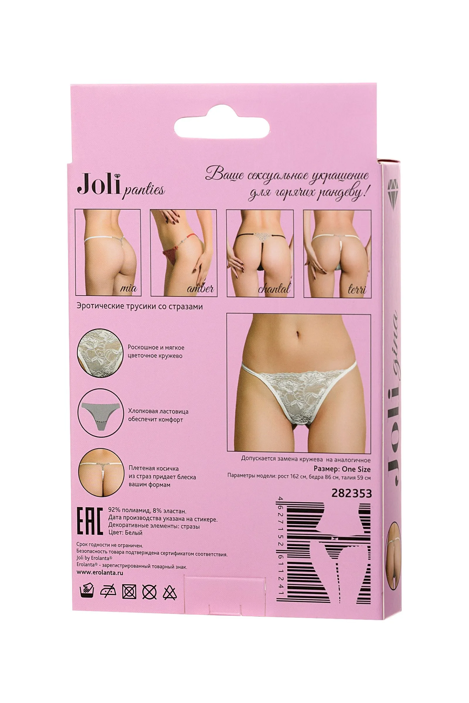 Joli panties – ваше сексуальное украшение для горячих рандеву! Новая линейка романтичного белья Joli (в пер. с французского красивая) радует глаз элегантными деталями и нежными материалами европейского качества. Изящное кружево с цветочным орнаментом спереди. Плетеная косичка из страз у основания ягодиц придает сексуальному образу блеска и яркости. Joli panties – выбери украшение для обольщения!