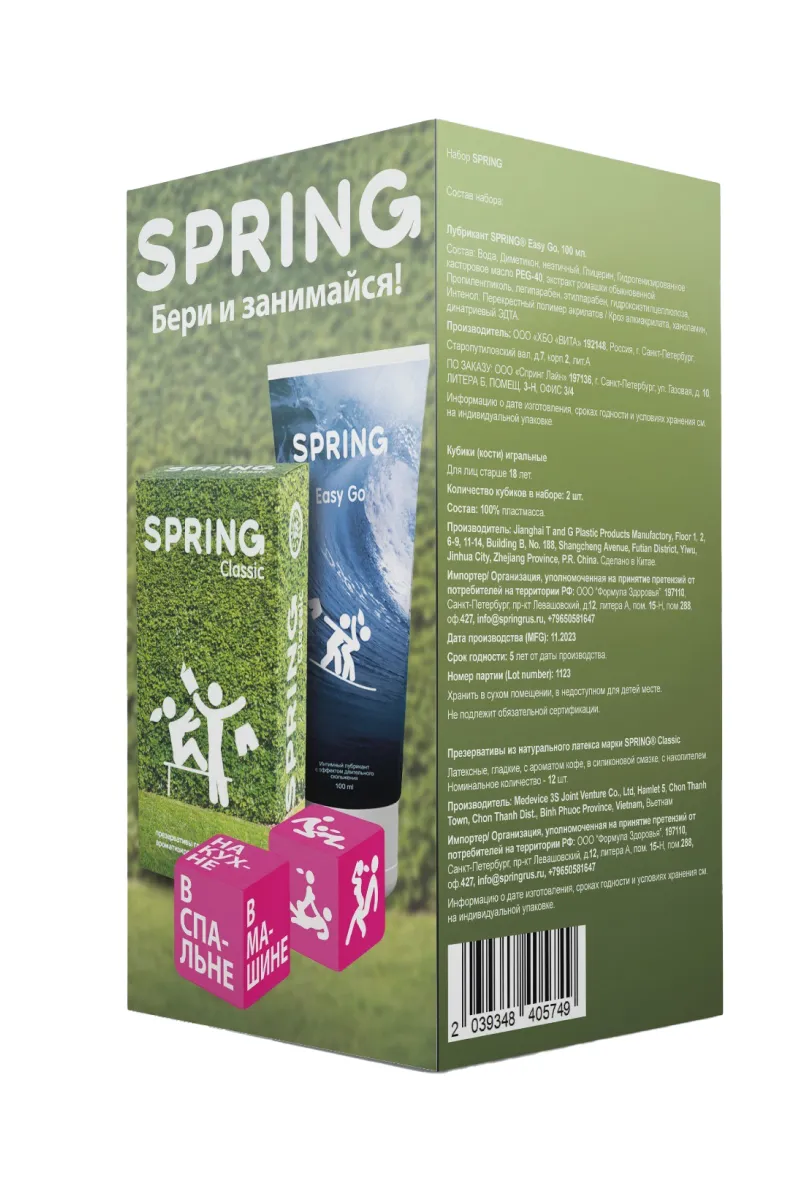 Набор SPRING с игральными кубиками, лубрикантом Easy Go 100мл и презервативами Classic №12