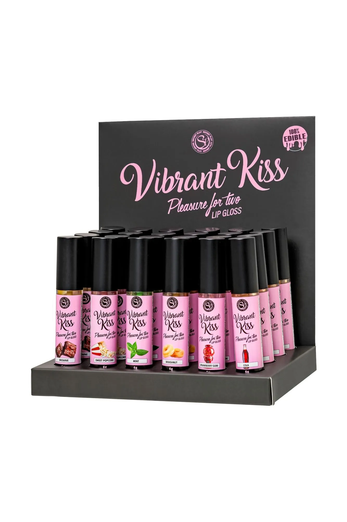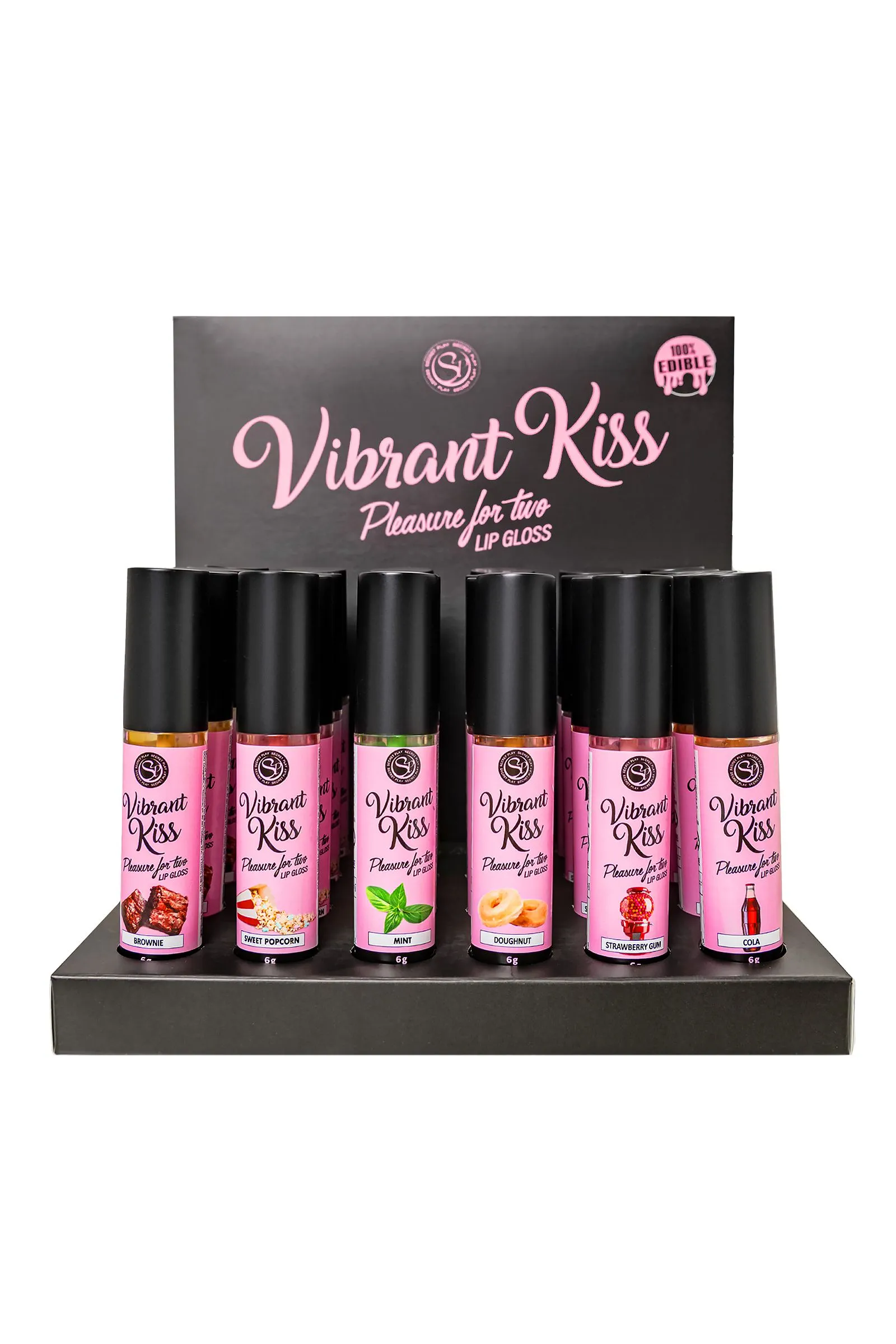 Восхитительные ощущения от сочетания сладкого поцелуя и волшебных мурашек дарят блески для губ Lip Gloss Vibrant Kiss. Ощущение взрыва, перед которым невозможно устоять. Блеск может доставить удовольствие обоим партнерам стимулирующими вибрационными волнами, которые ощутимы уже через несколько секунд после нанесения на губы. Его вибрационные волны вызывают приятное покалывание, которое способствует стимуляции нервных окончаний и повышает чувствительность эрогенных зон, увеличивая удовольствие. Партнер ощутит мурашки при поцелуе и в интимной зоне при оральном сексе. Кроме того, этот блеск придает 3D эффект губам, делая их более сочными и объемными. Стильный дисплей-подставка в цветах бренда гарантированно вызывает интерес покупателей. Установите дисплей в прикассовой зоне, чтобы эффектно оформить витрину. Выбирайте один из 6 восхитительных вкусов, или миксуйте разные сочетания, которые на 100% съедобны. Набор из 6 разнообразных вкусов и ароматов в специальном дисплее-подставке включает в себя: 4 блеска для губ Vibrant Kiss Strawberry Gum с умопомрачительным вкусом и ароматом клубничной жвачки, арт. 3653 4 блеска для губ Vibrant Kiss Mint – вкус и аромат сладкой освежающей мяты, арт. 3645. 4 блеска для губ Vibrant Kiss Brownie – вкус и аромат шоколадного печенья, арт. 3655 4 блеска для губ Vibrant Kiss Coke – вкус и аромат Колы, арт. 3657. 4 блеска для губ Vibrant Kiss Sweet Popcorn – вкус и аромат попкорна, арт. 3658. 4 блеска для губ Vibrant Kiss Doughnut – вкус и аромат пончика, арт. 3656. Способ применения: Нанесите на губы, через несколько секунд вы почувствуете стимулирующую вибрацию. Объем: 6 гр Глицериновая основа Совместимость с презервативами и игрушками 100% съедобно Перед использованием взболтать Сделано в Испании Меры предосторожности: Встряхните перед использованием. Не используйте при гиперчувствительности или аллергии на ингредиенты. Не наносите на глаза или на раны. Держись подальше от детей. Держите в прохладном, сухом месте, вдали от солнечных лучей. В случае раздражения прекратить использование.