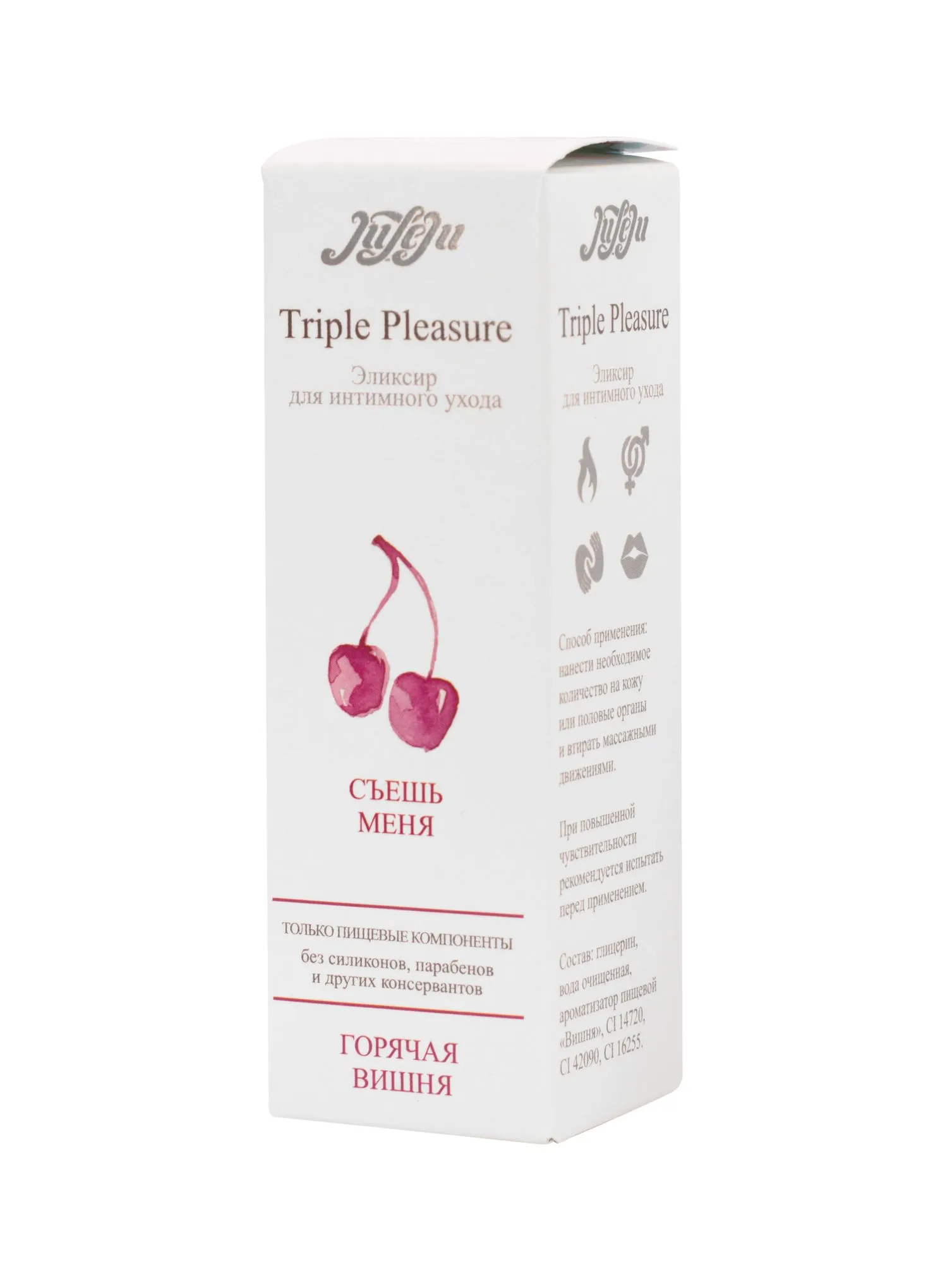 Эликсир для интимного ухода "Горячая Вишня" раскроет всю чувственность прикосновений, погружая в водоворот сладкой неги. Эликсир прекрасно подходит для чувственного массажа и обеспечивает длительное скольжение в качестве интимного лубриканта. Согревающий эффект раскрывается в полной мере под воздействием дыхания и поцелуев. Подходит для всех видов интимных ласк. Не содержит парабенов и других консервантов, в состав эликсира входят только пищевые компоненты. Состав: глицерин, вода очищенная, ароматизатор пищевой “Вишня”, CI 14720, CI 42090, CI 16255. Упаковка: картонная коробка с принтом. срок годности-2 года.