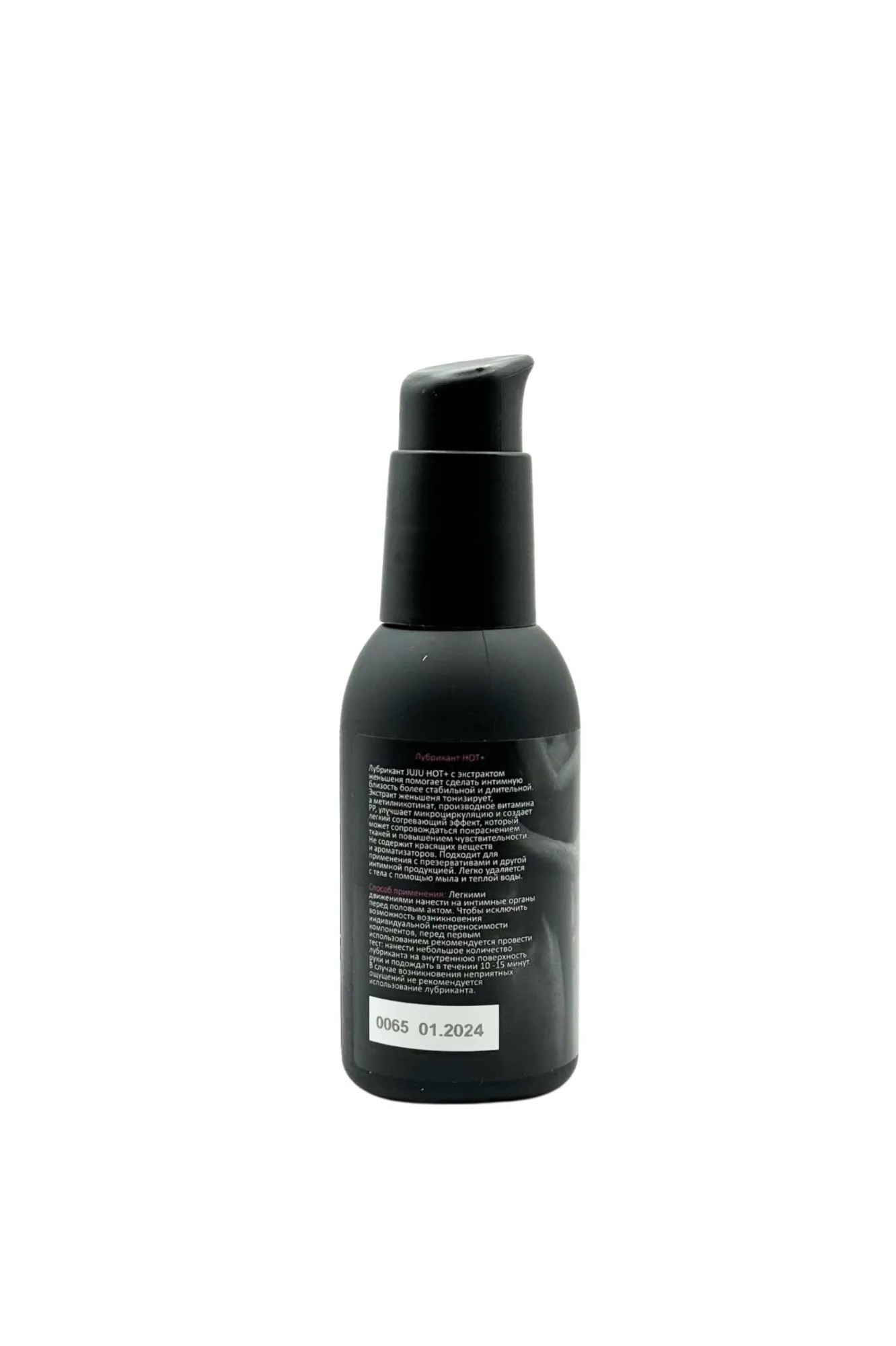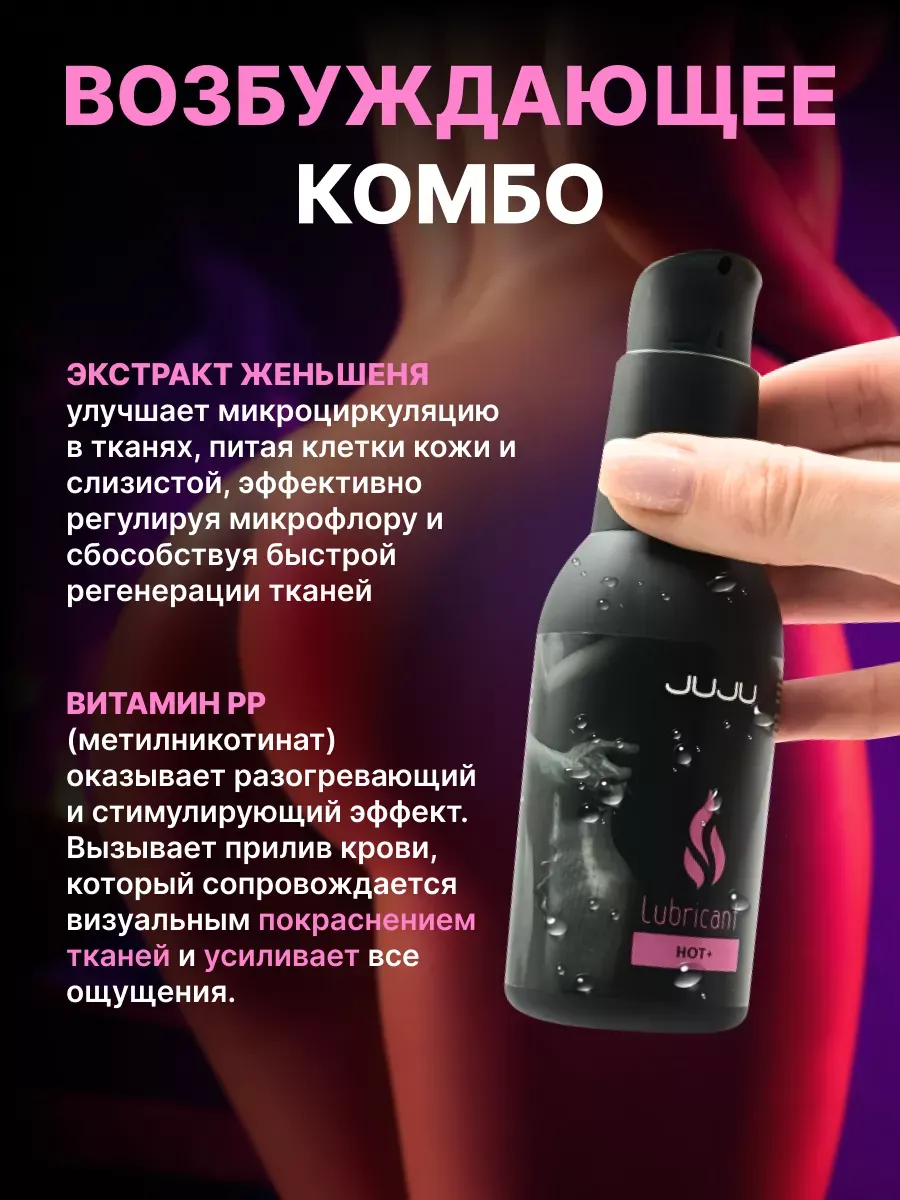Лубрикант JUJU HOT+ с экстрактом женьшеня обладает возбуждающим эффектом. Экстракт женьшеня тонизирует, а метилникотинат, производное витамина РР, улучшает микроциркуляцию и создает легкий согревающий эффект, который может сопровождаться покраснением тканей и повышением чувствительности. Не содержит красящих веществ и ароматизаторов. Лубрикант совместим с презервативом и другой интимной продукцией. Легко смывается мыльной водой. Состав: вода очищенная, глицерин, ПЭГ-400, экстракт женьшеня, метилпарабен,этилпарабен в пропиленгликоле, гидроксиэтилцеллюлоза, метилникотинат, сополимер акрилатов, ЭДТА. Срок годности- 3 года.
