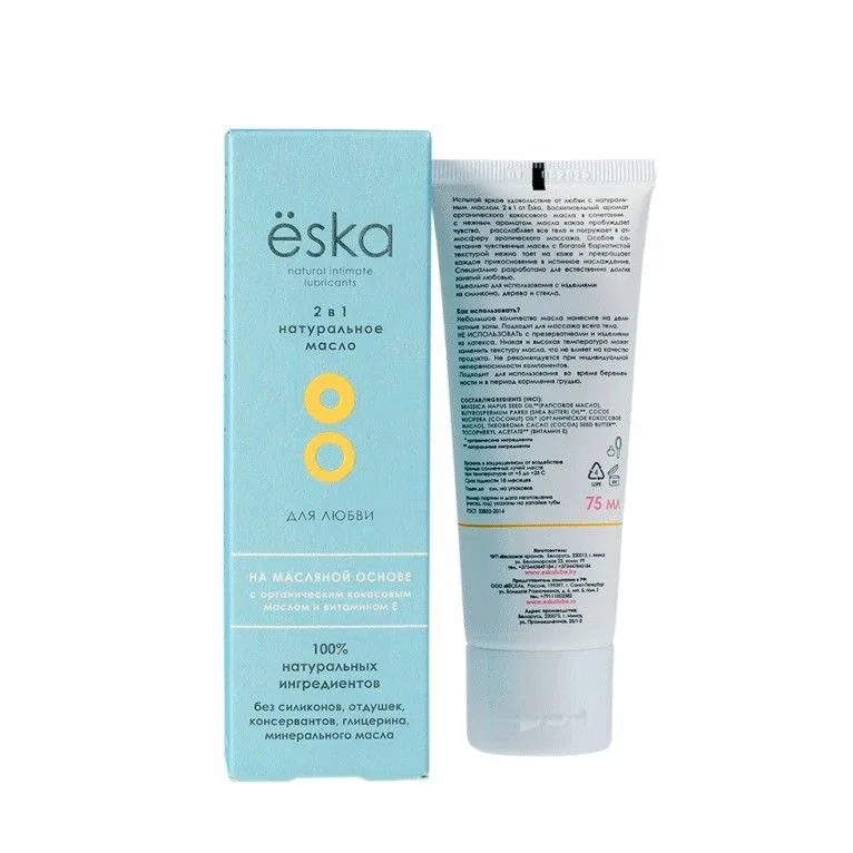 Ёska – это новое поколение лубрикантов со 100% безопасной, чистой и натуральной формулой. Формула содержит только сертифицированные органические экстракты и натуральные растительные ингредиенты, которые без вреда для здоровья помогут достичь полного комфорта и удовольствия во время занятий любовью. Испытай яркое удовольствие от любви с натуральным маслом 2 в 1 от Ёska – оно сочетает в себе лубрикант и массажное масло и является натуральной альтернативой силикону.