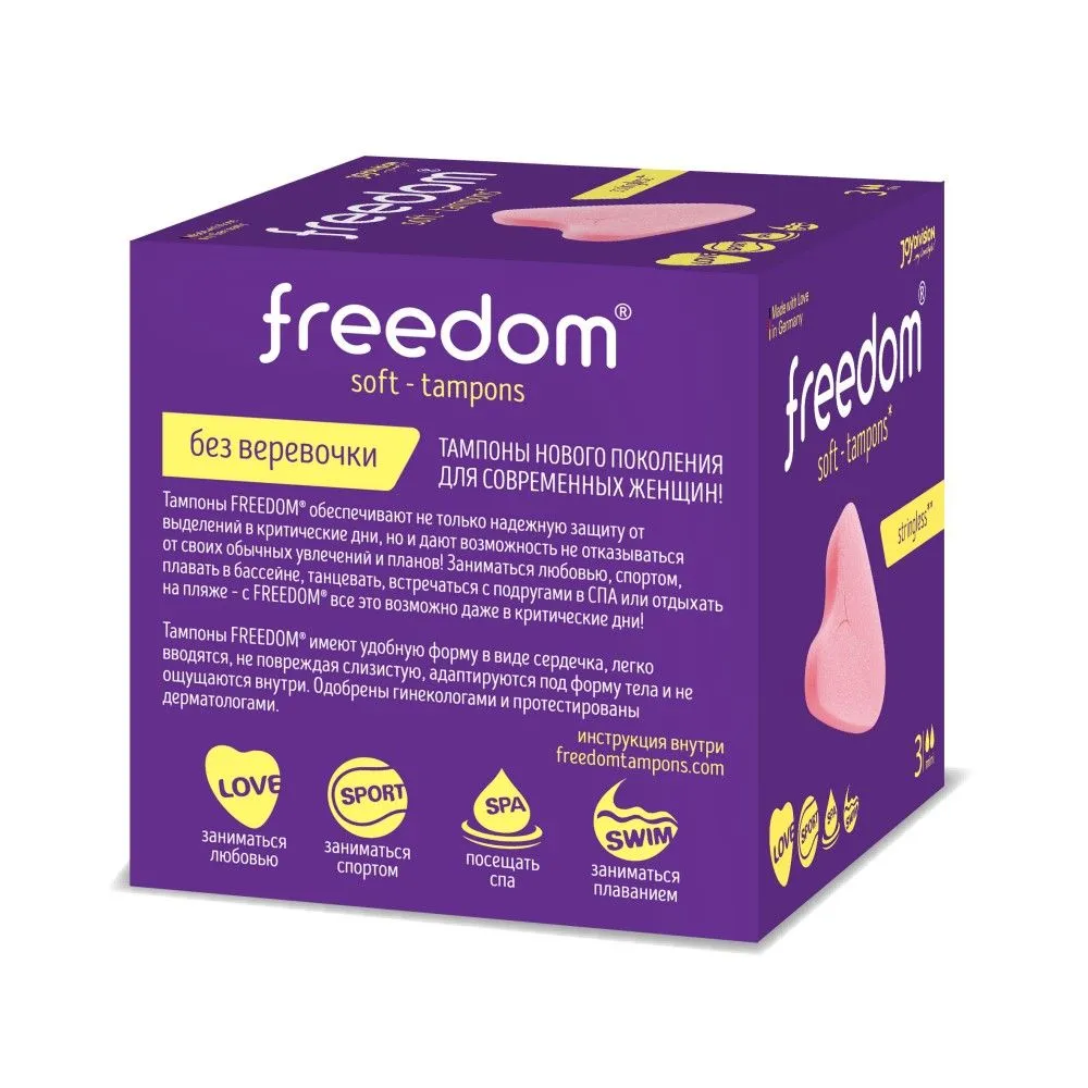 Тампоны FREEDOM без веревочки – это возможность жить полной жизнью в любой день цикла. С ними можно заниматься спортом, плавать и посещать СПА в критические дни и даже заниматься сексом во время месячных без ограничений. Секрет в супермягком материале и уникальной форме тампонов Фридом в виде сердечка. Для извлечения предусмотрена не привычная ниточка, а специальная прорезь. Благодаря этому тампоны без веревочки абсолютно незаметны под любой одеждой (и даже без нее), не ощущаются во время активных движений и даже в момент интимной близости.