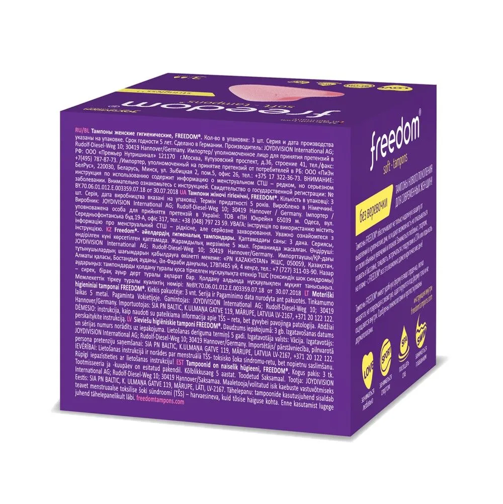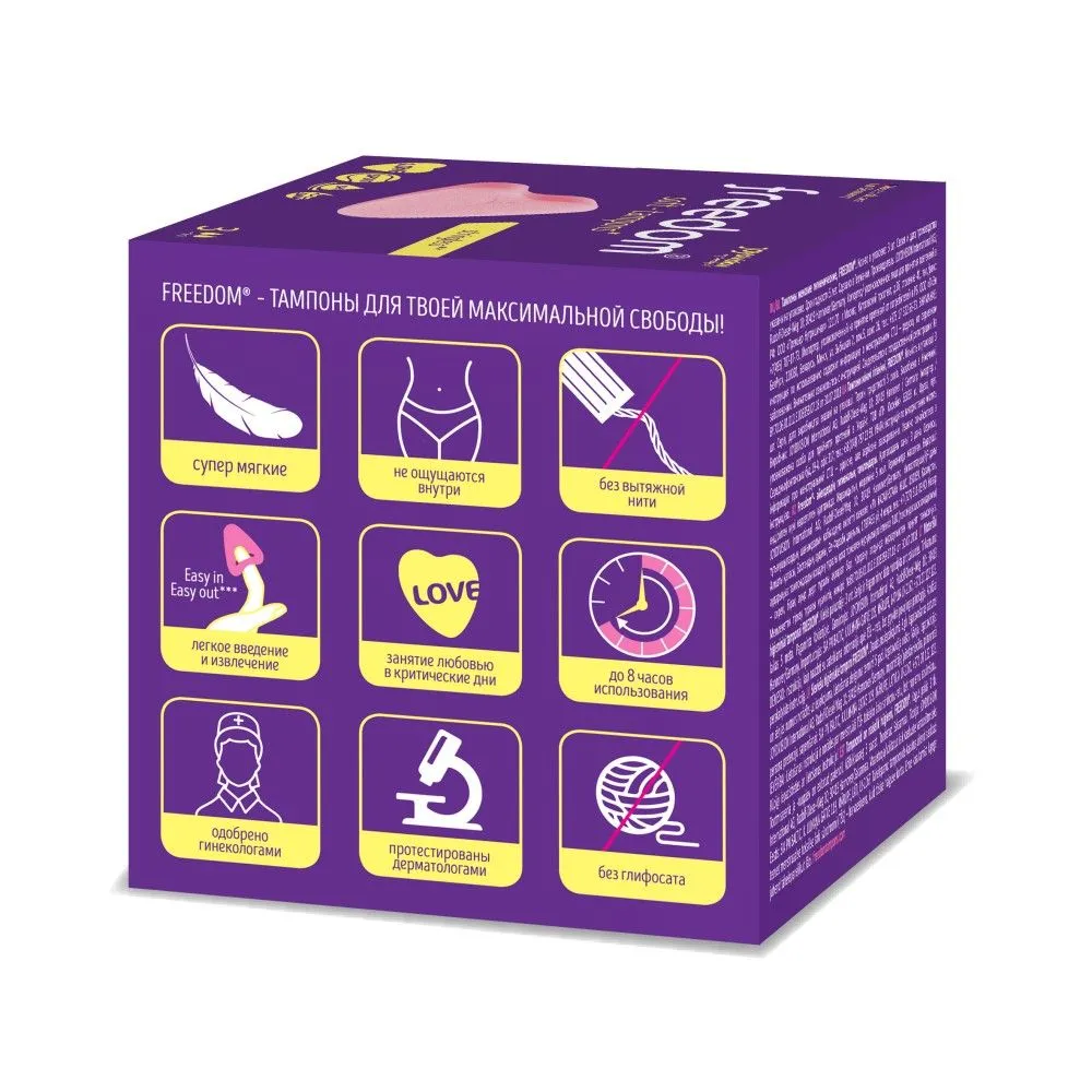 100% безопасный медицинский материал, разработанный для тампонов Фридом экспертным советом в Германии, не пересушивает слизистую и не травмирует ткани при введении и извлечении. Материал тампонов FREEDOM не увеличивается в размерах при впитывании. Вот прочему FREEDOM - это комфортные тампоны для секса и спорта, купания и активного образа жизни. Купание с тампоном, тренировки, фитнес и даже секс с тампоном – теперь ничто не помешает!