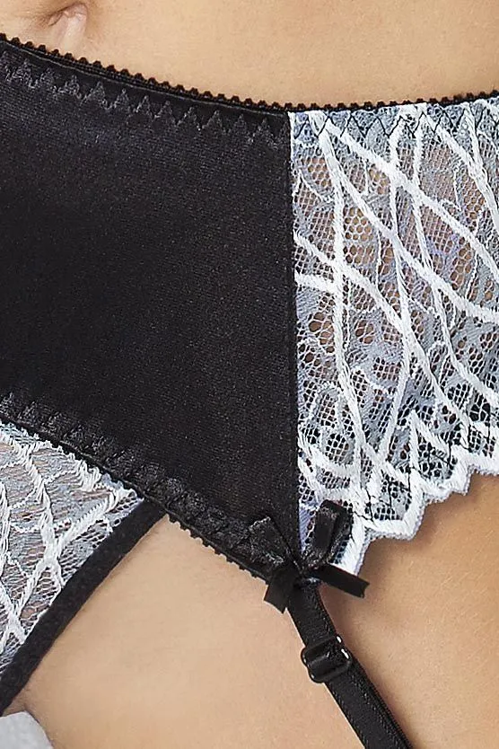 Элегантный набор белья Ingrid от бренда Lapin Rose выполнен из эластичного испанского атласа и декорирован тонким итальянским кружевом и пикантными бантиками. Такое сексуальное белье отлично подойдет для проведения страстного вечера с возлюбленным, ведь в нем Вы будете просто неотразимы! В комплект входят: бюстгальтер, трусики-стринг, пояс с подвязками. Лямки бюстгальтера и подвязки регулируются по длине.