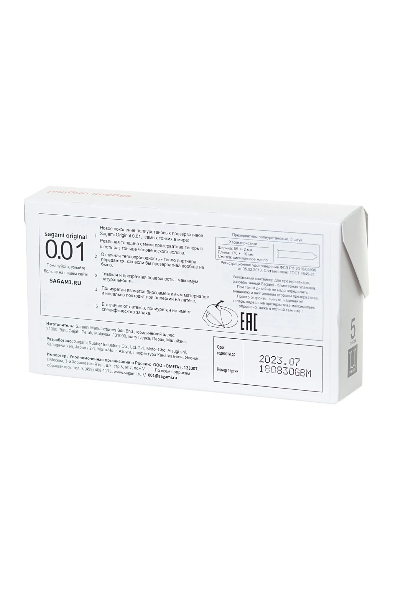 —Презервативы Sagami, original 0.01, полиуретан, 17 см, 5,5 см, 5 шт.