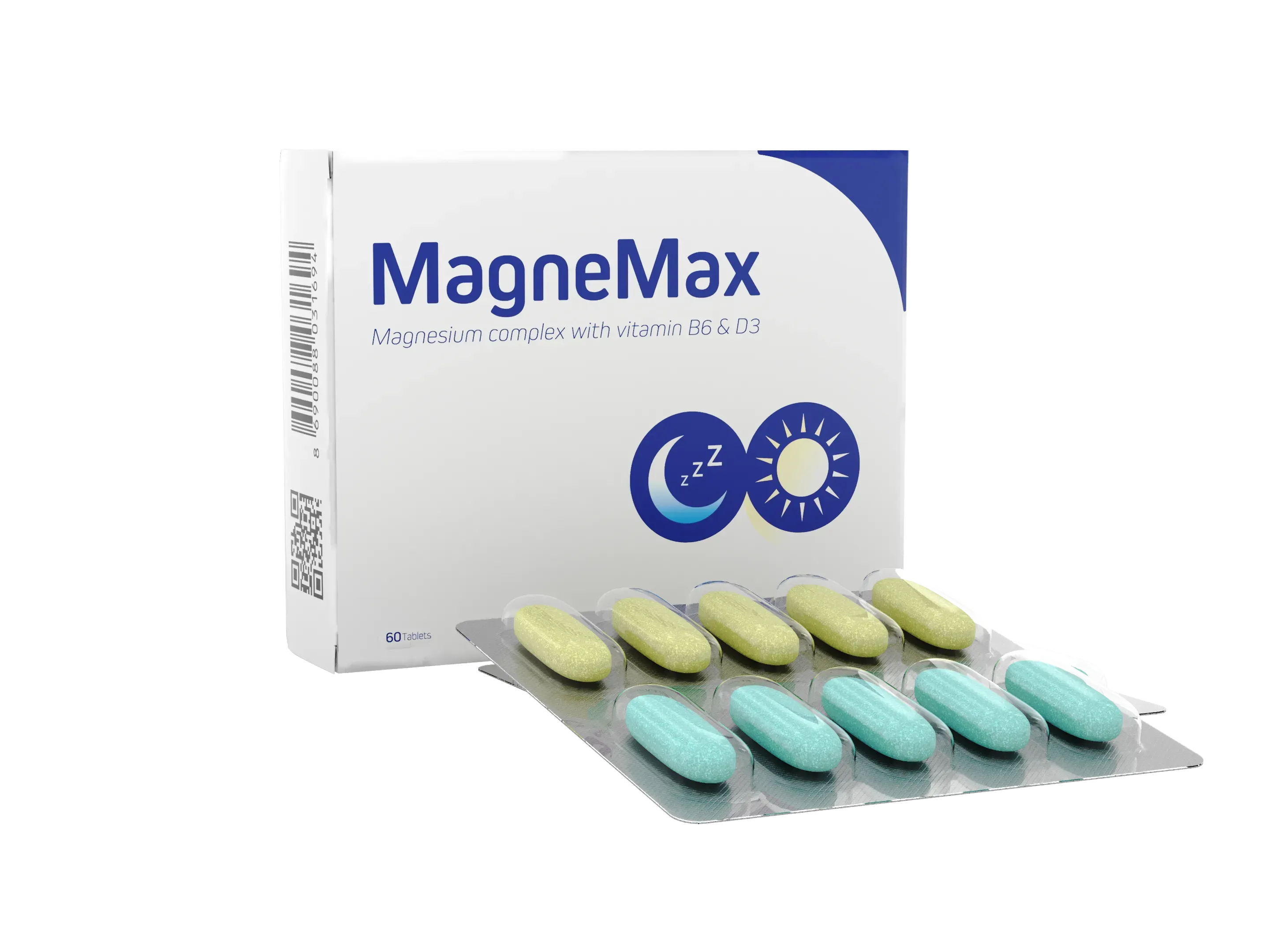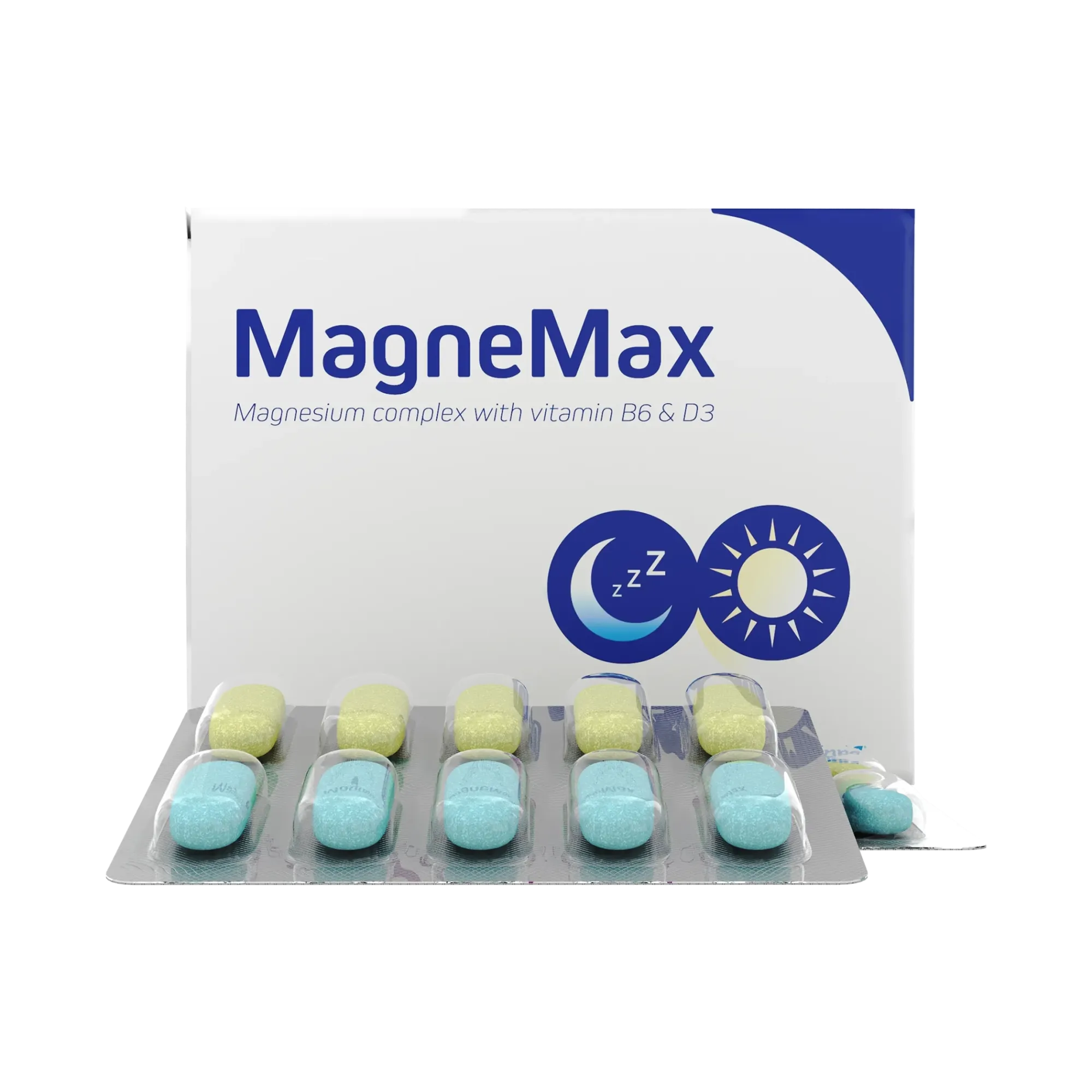 магния бисглицинат, микрокристаллическая целлюлоза (E460i, носитель), лактоза моногидрат, крахмал кукурузный, поливинилпирролидон (E1201, стабилизатор), магниевая соль стеариновой кислоты (E470, антислеживающий агент), бриллиантовый голубой FCF (E133, краситель), плёночная оболочка (гидроксипропилметилцеллюлоза (E464, загуститель), кальция сульфат (E516, носитель), магния карбонат (E504, регулятор кислотности), гидроксипропилцеллюлоза (E463, загуститель), жирные кислоты (E570, стабилизатор), полиэтиленгликоль (E1521, носитель), витамин B6 (пиридоксина гидрохлорид), витамин D3 (холекальциферол)