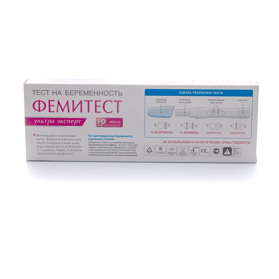 Струйный тест с ультравысокой чувствительностью нового поколения для определения беременности в домашних условиях ЗА 4 ДНЯ ДО предполагаемого дня начала менструации. Струйный тест – означает, что для проведения теста вам не нужно собирать мочу в ёмкость. Это обеспечивает гигиеничность процедуры. Действие теста основано на определении в моче женщины концентрации хорионического гонадотропина человека (ХГч) – это гормон, который начинает вырабатываться тканью хориона после имплантации эмбриона в стенку матки.