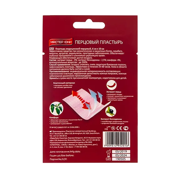 Согревающий перцовый пластырь на основе эластичной ткани из 100% хлопка. Эффективное средство при ревматических и мышечных болях, артритах, радикулитах, люмбаго, простудных заболеваниях. Обеспечивает глубокое прогревание и усиленную циркуляцию крови.