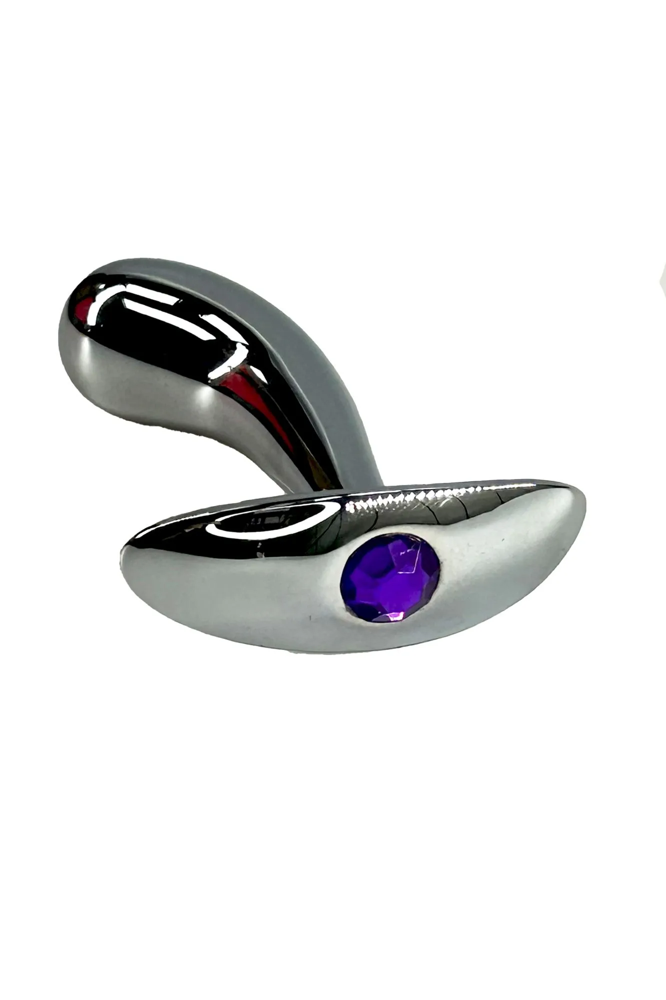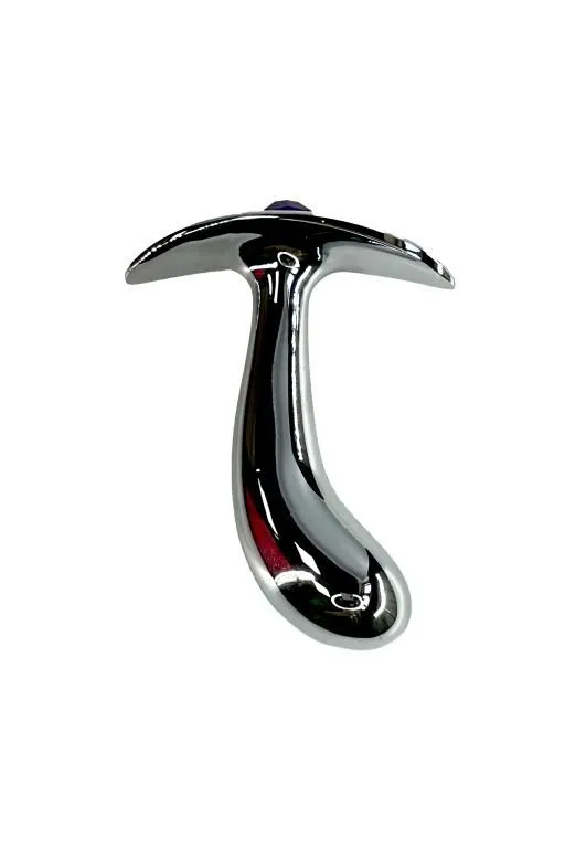 Литая анальная пробка имеет изогнутую каплевидную форму и гладкую фактуру шлифованного металла. Легкий и прочный алюминиевый сплав гарантирует долговечность и гигиеничность, а также абсолютную безопасность даже при постоянном ношении. Гладкий ограничитель украшен небольшим фиолетовым кристаллом.