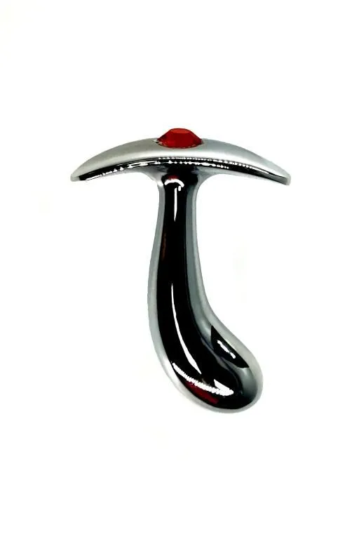 Литая анальная пробка имеет изогнутую каплевидную форму и гладкую фактуру шлифованного металла. Легкий и прочный алюминиевый сплав гарантирует долговечность и гигиеничность, а также абсолютную безопасность даже при постоянном ношении. Гладкий ограничитель украшен небольшим красным кристаллом.