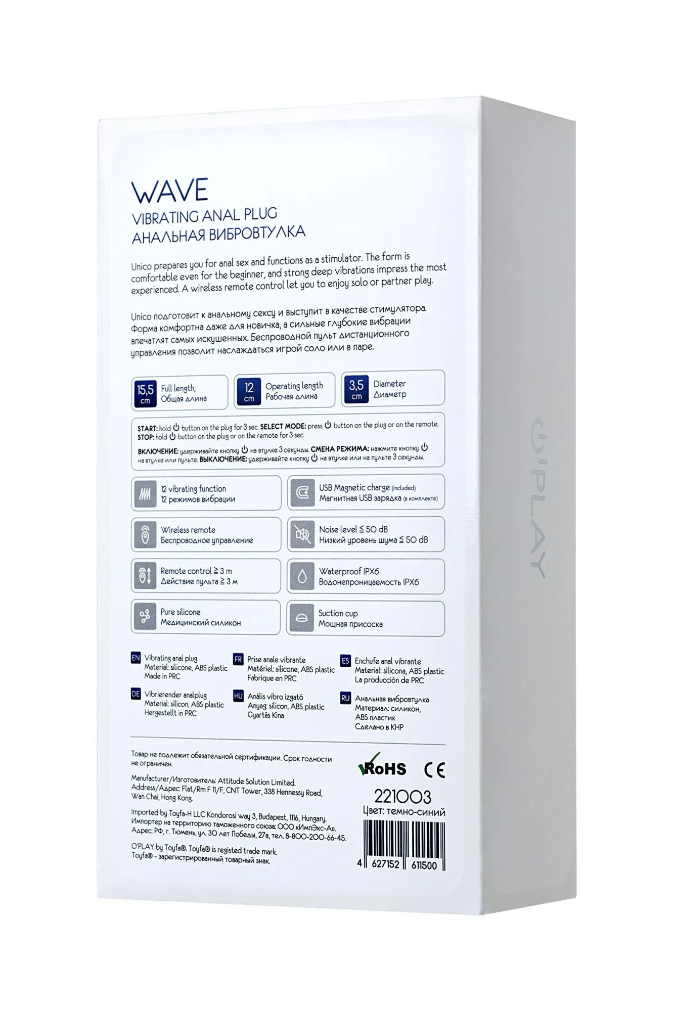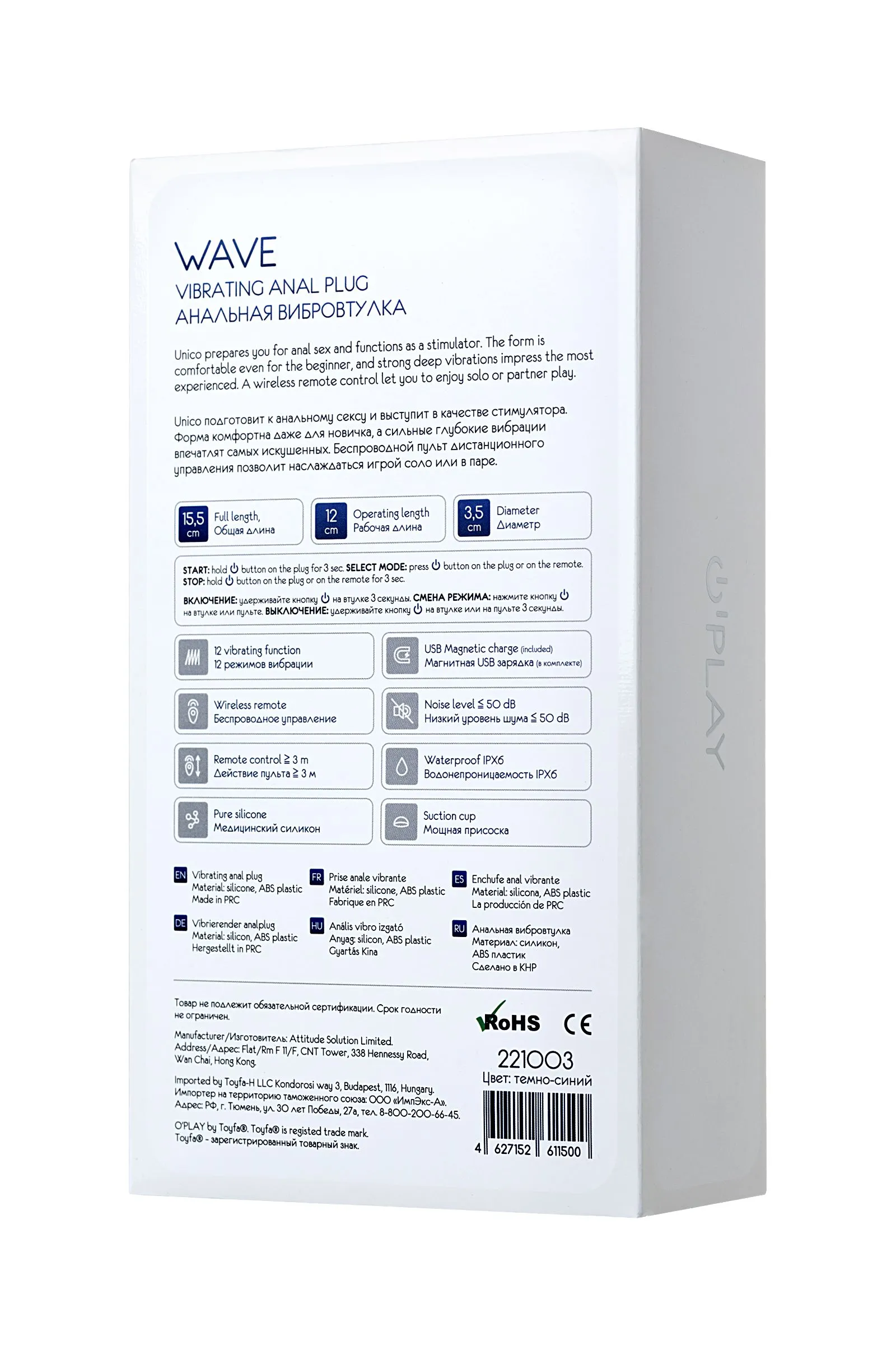 Анальная вибровтулка O'Play Wave с пультом ДУ, силикон, синий, 15,5 см.