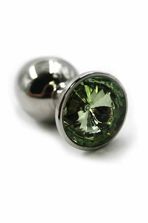 Анальная пробка из аллюминия размер L. Длина - 8,4 см, диаметр - 4 см, вес - 165,5 грамма. Страз в основании круглой формы, выполнен из стекла светло-зеленого цвета. Упакована в вельветовый мешочек для хранения.