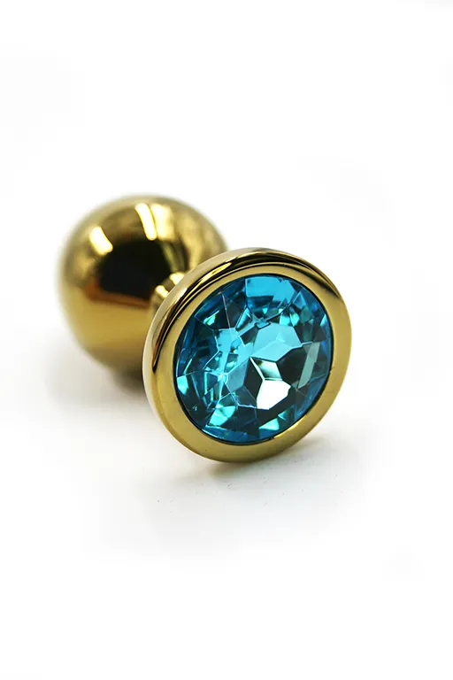 Золотая анальная пробка из аллюминия размер M. Длина - 7 см, диаметр - 3,4 см, вес 82,5 грамма. Страз в основании круглой формы, выполнен из стекла голубого цвета. Упакована в вельветовый мешочек для хранения.