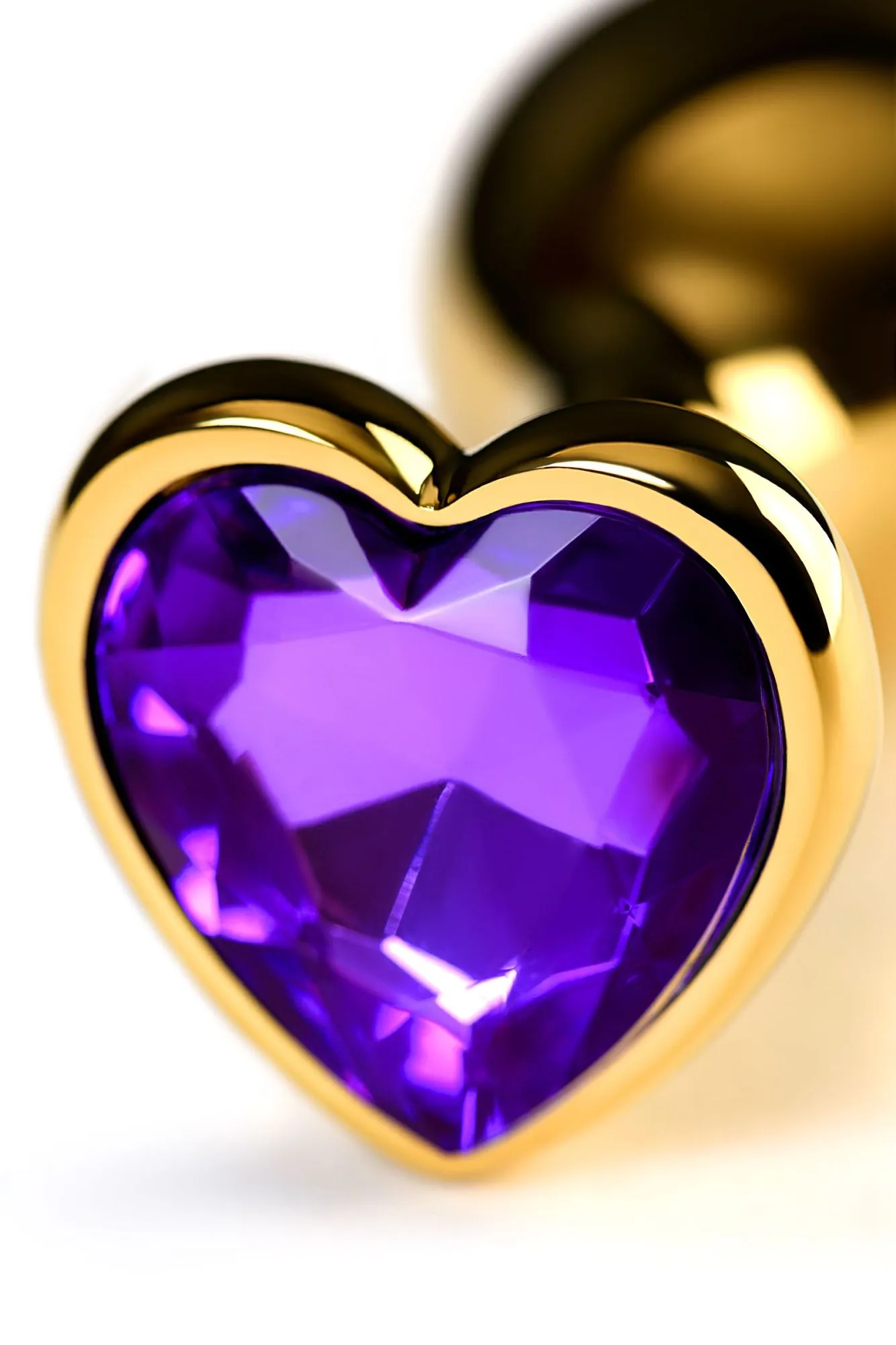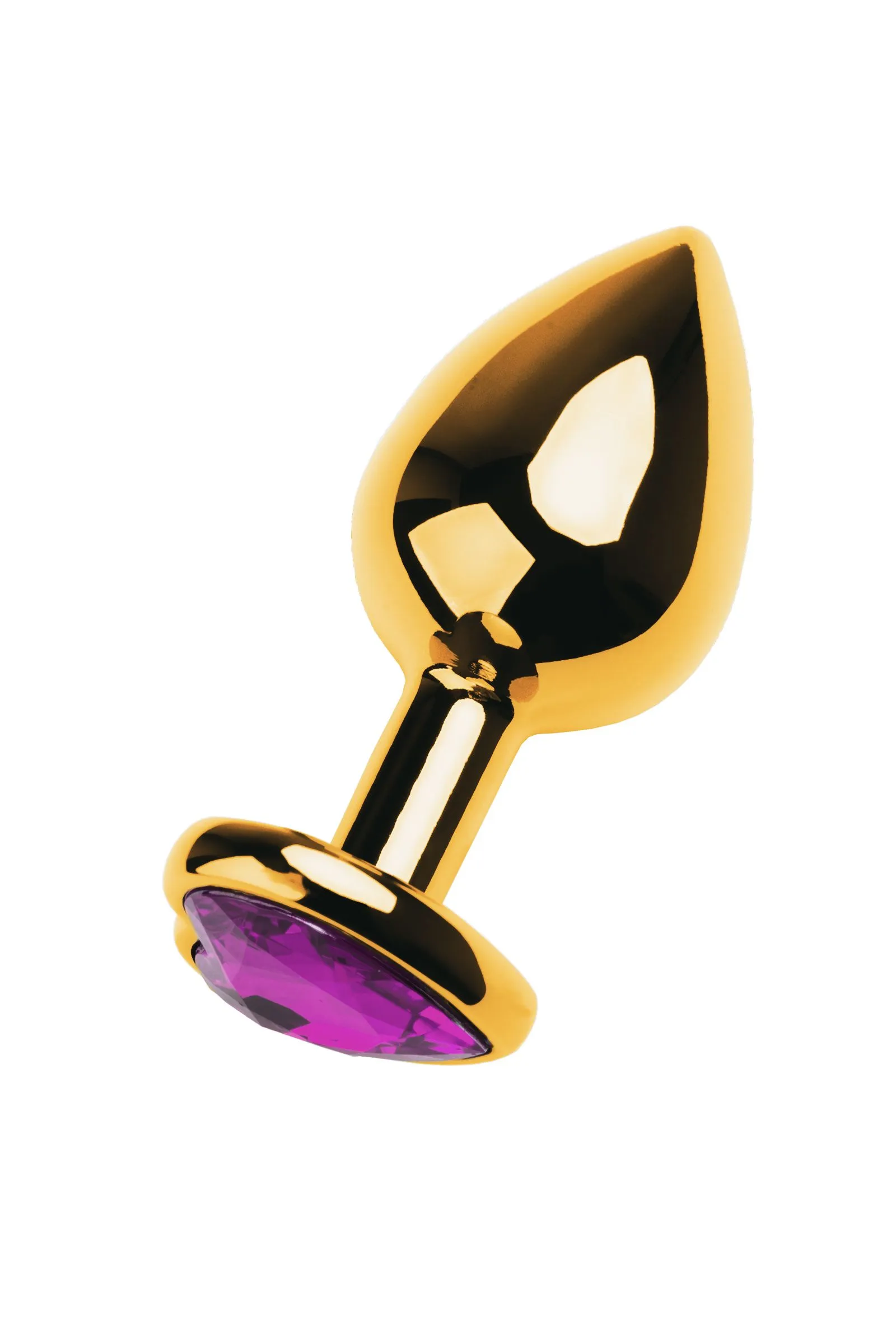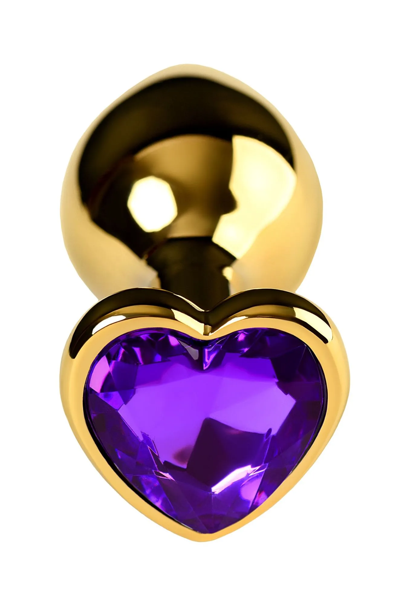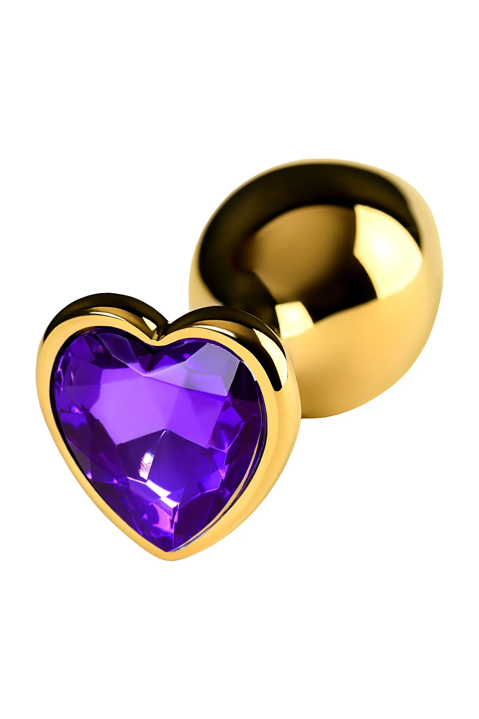 Золотистая анальная втулка из легкого сплава ощутима по форме, но комфортна по весу. Страз в форме сердечка цвета аметист украсит ваши игры.