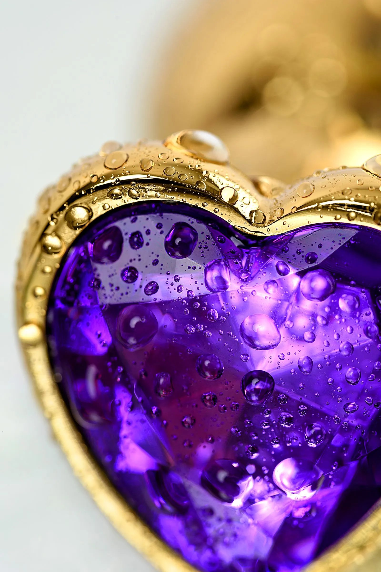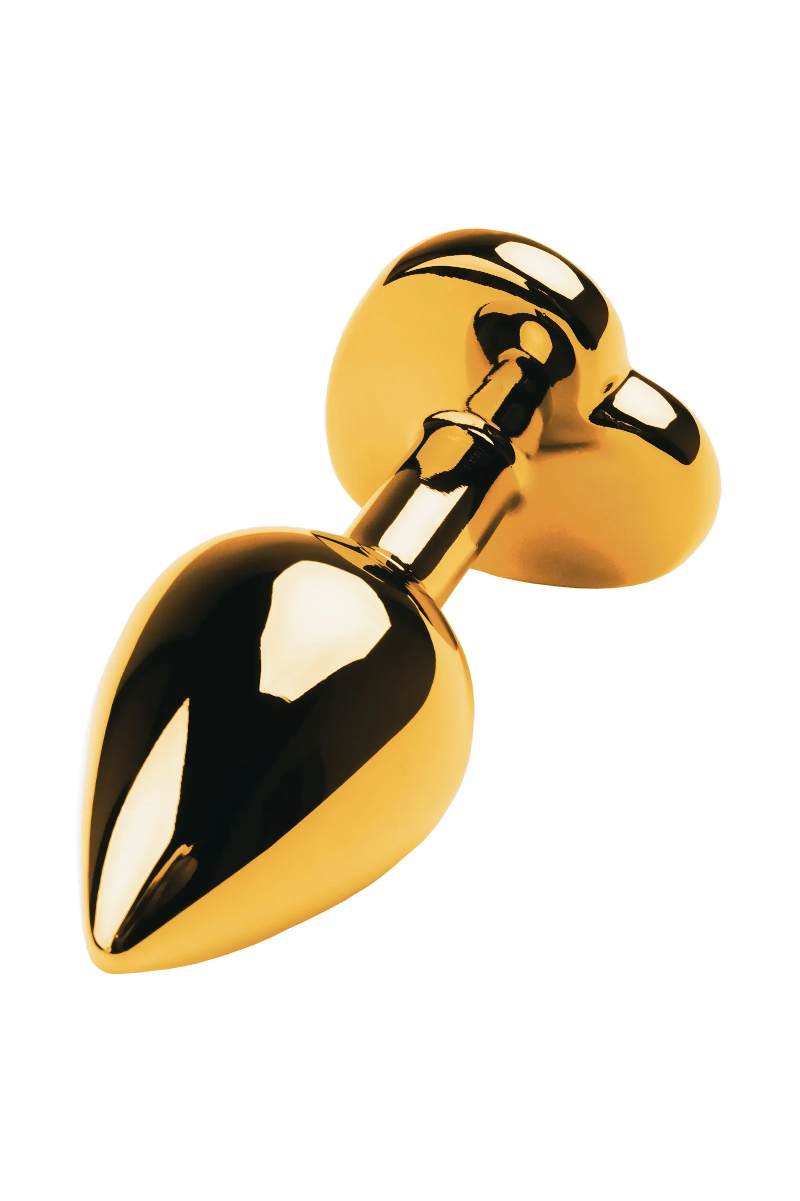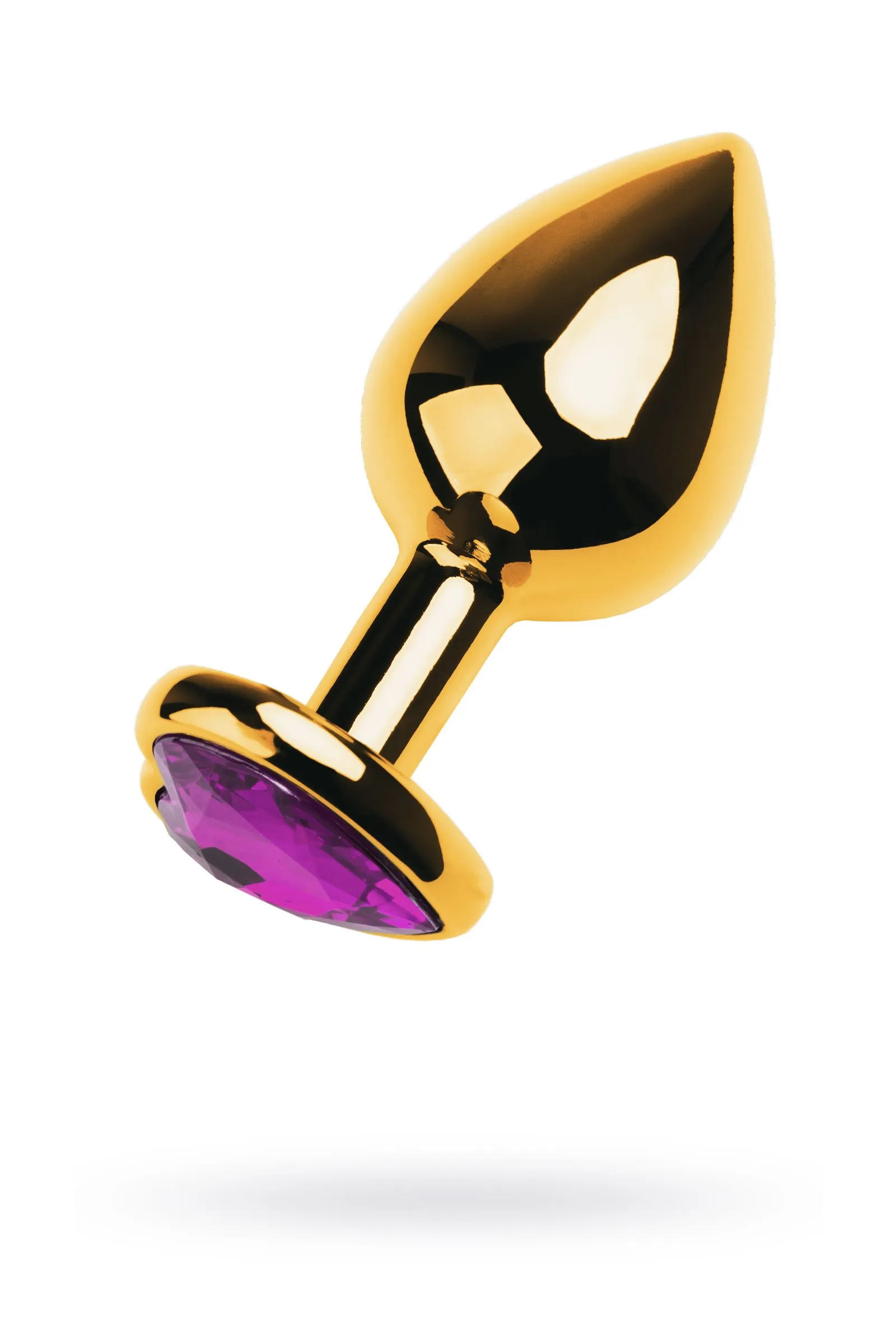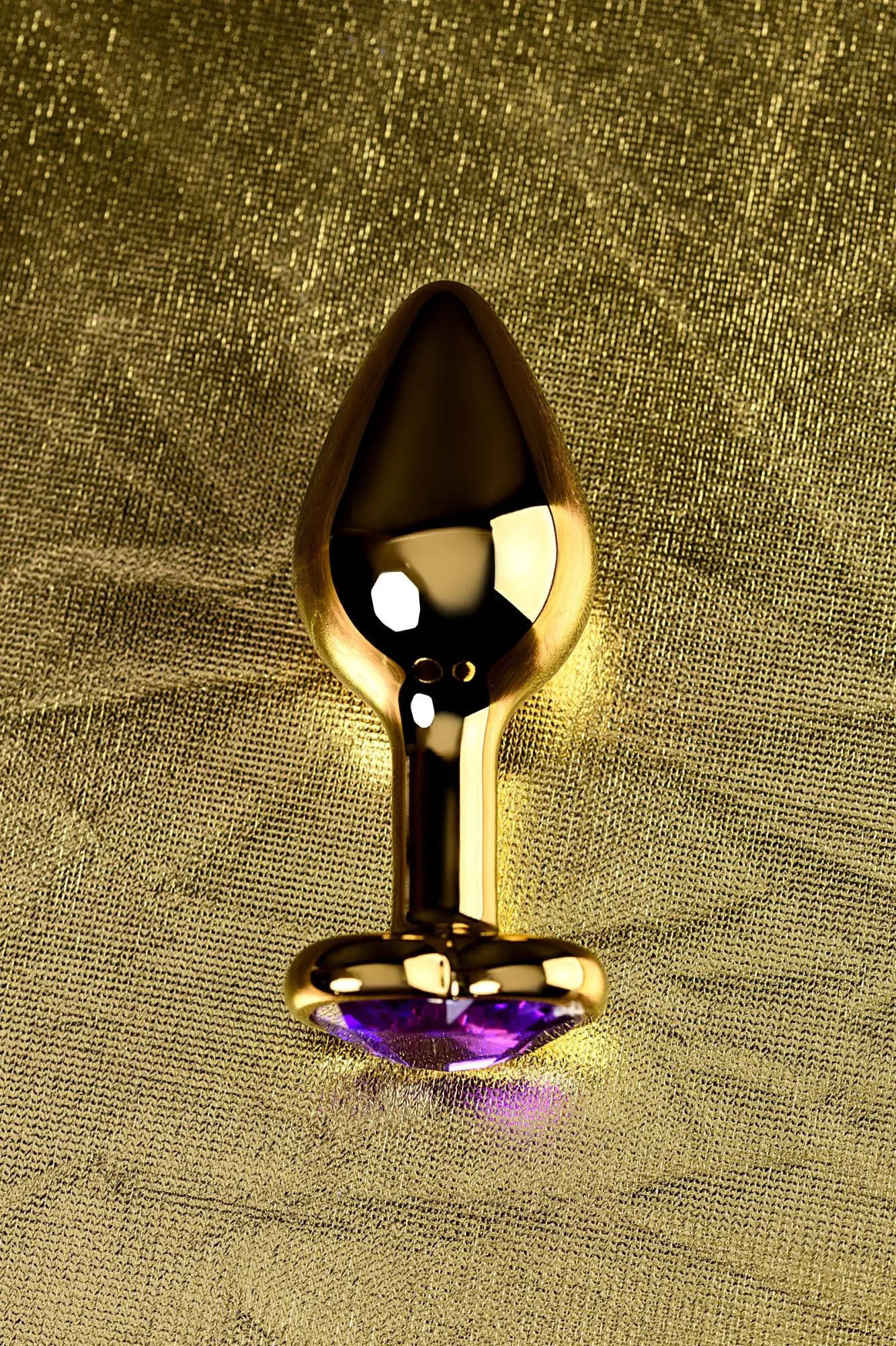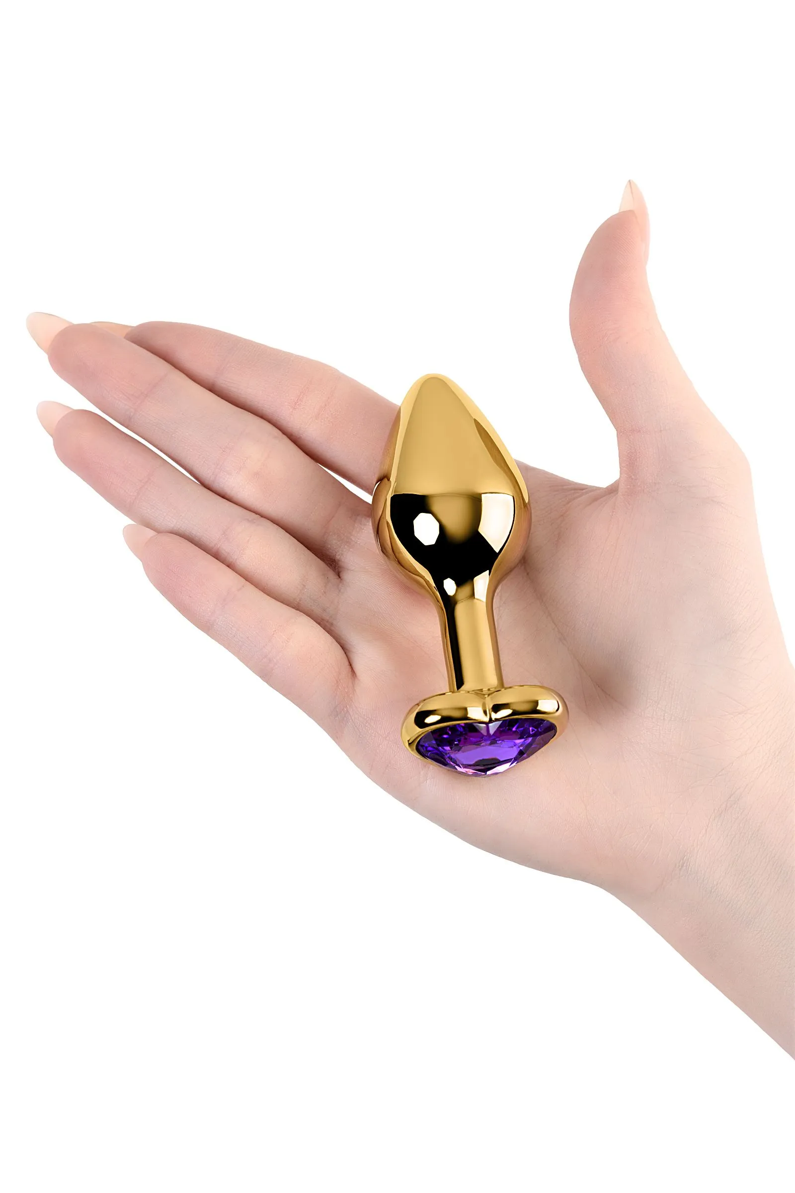 Золотистая анальная втулка из легкого сплава ощутима по форме, но комфортна по весу. Страз в форме сердечка цвета аметист украсит ваши игры.