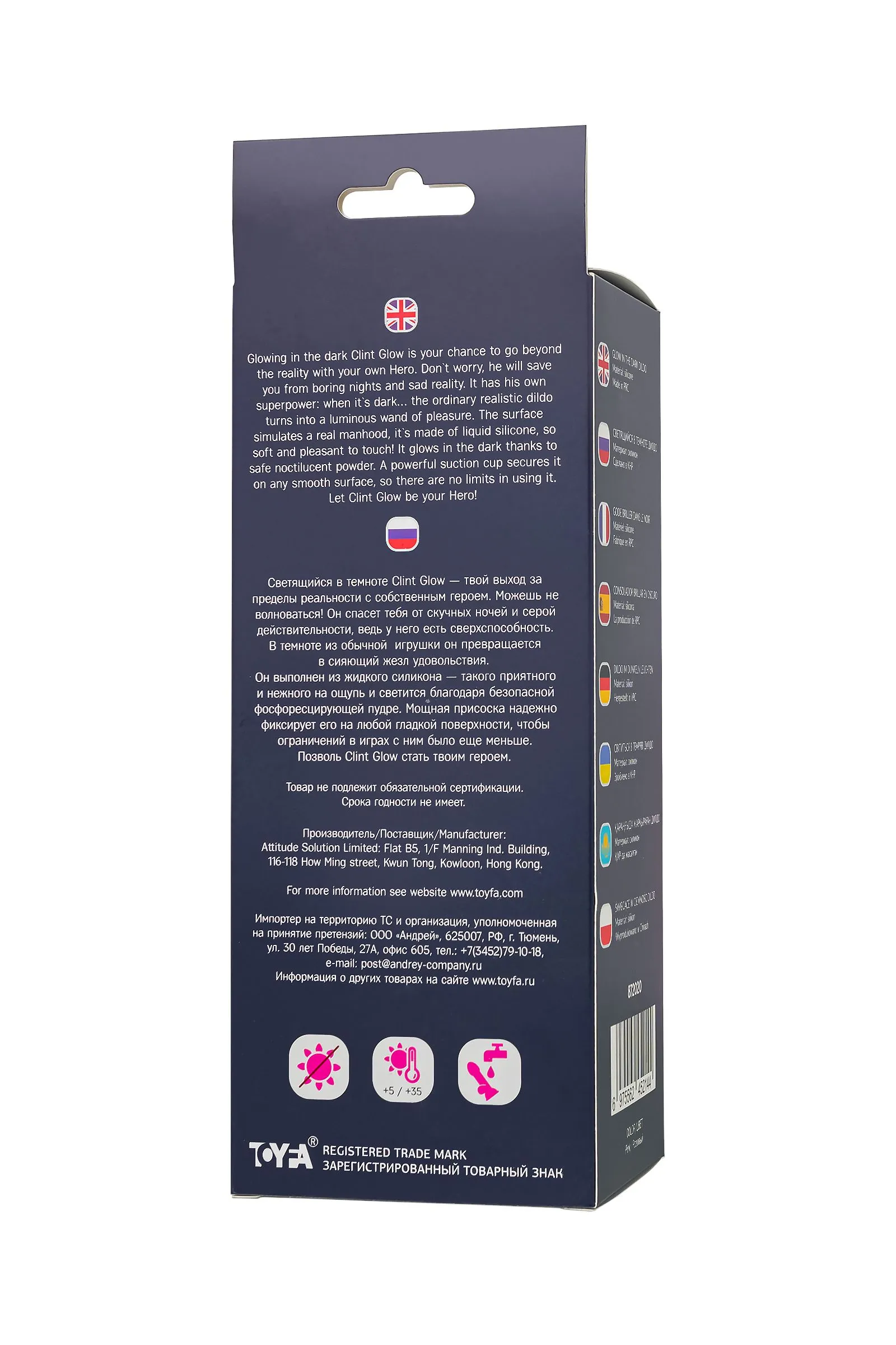 Светящийся в темноте Clint Glow — твой выход за пределы реальности с собственным героем. Можешь не волноваться! Он спасет тебя от скучных ночей и серой действительности, ведь у него есть сверхспособность. В темноте из обычной игрушки он превращается в сияющий жезл удовольствия. Он выполнен из жидкого силикона — такого приятного и нежного на ощупь и светится благодаря безопасной фосфоресцирующей пудре. Мощная присоска надежно фиксирует его на любой гладкой поверхности, чтобы ограничений в играх с ним было еще меньше. Позволь Clint Glow стать твоим героем. Материал - силикон Полностью светится в темноте Общая длина 20 см Водонепроницаемый
