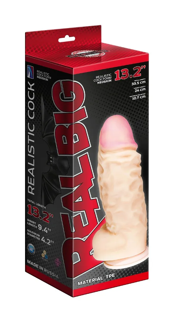 Реалистик большого размера из материала «NEOSKIN». Использована технология нанесения сверхмягкого материала на эластичный, полужесткий каркас. Подобрано оптимальное соотношение упругости, мягкости , тактильных ощущений – словом всего того, что напоминает биологический прототип, но очень больших размеров. Длина общая - 33,5см, длина рабочая - 24см, диаметр - 10,7 см, диаметр головки - 9,6см