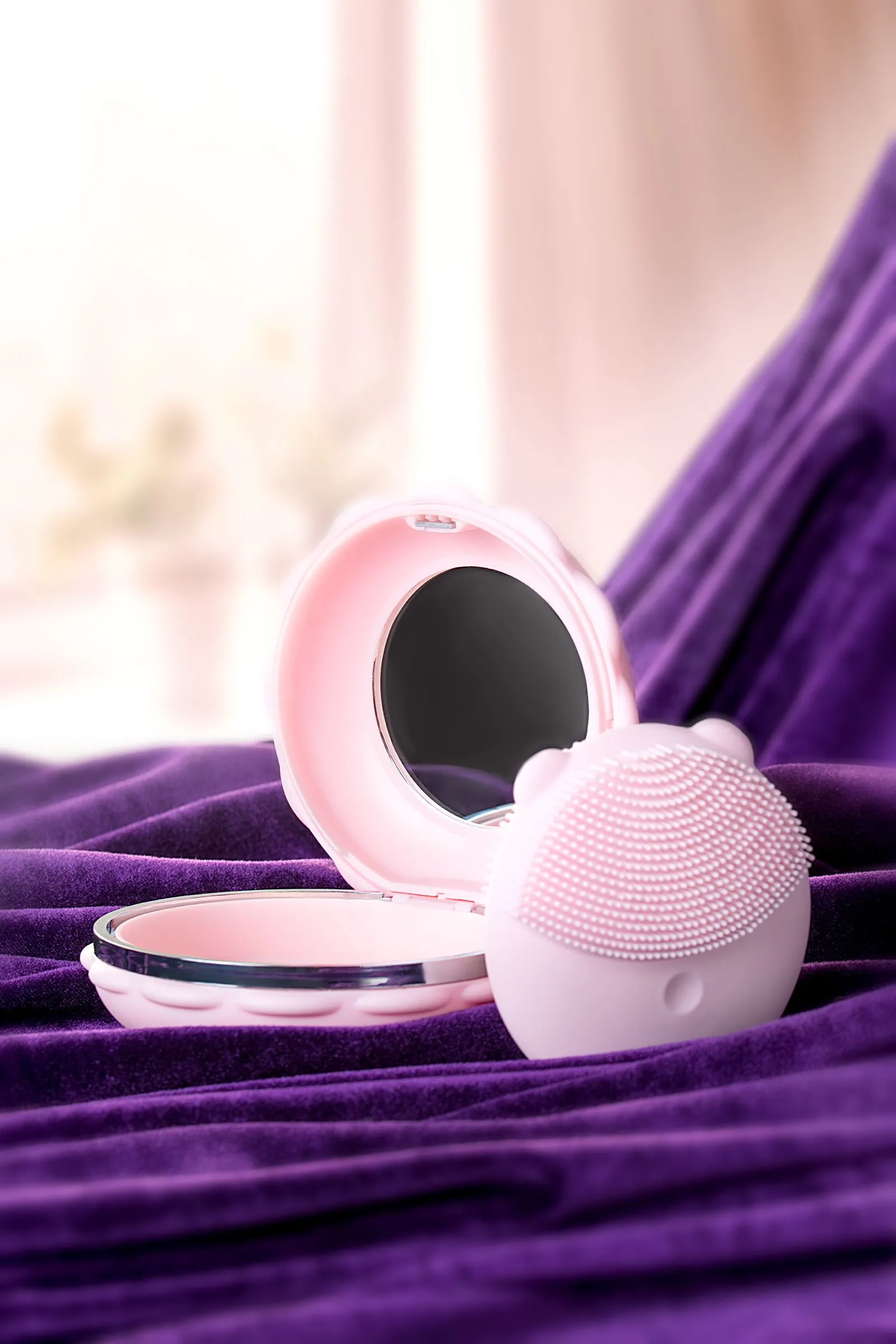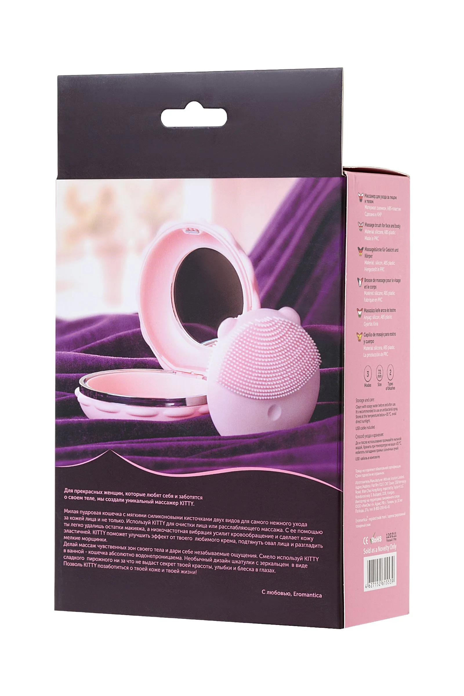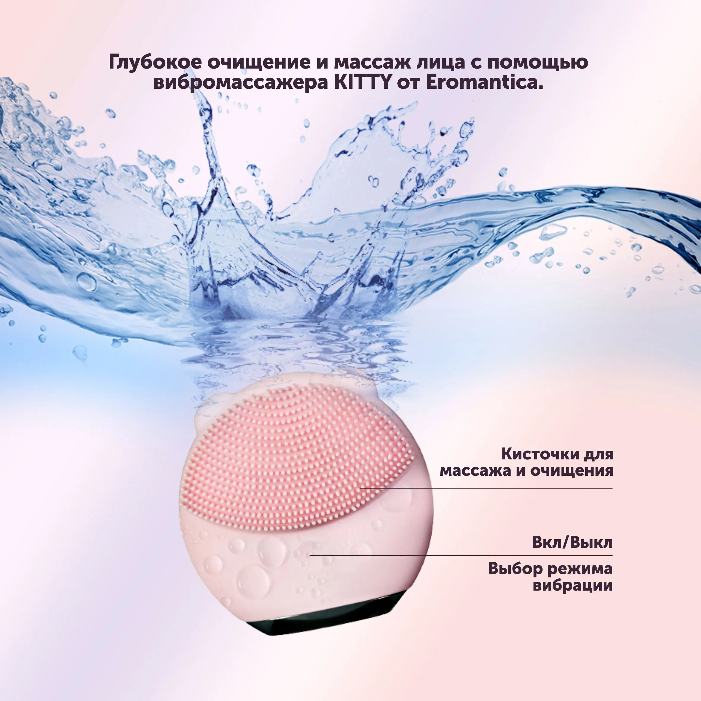 Для прекрасных женщин, которые любят себя и заботятся о своем теле, мы создали уникальный массажер KITTY. Милая пудровая кошечка с мягкими силиконовыми кисточками двух видов для самого нежного ухода за кожей лица и не только. Используй KITTY для очистки лица или расслабляющего массажа. С ее помощью ты легко удалишь остатки макияжа, а низкочастотная вибрация усилит кровообращение и сделает кожу эластичней. KITTY поможет улучшить эффект от твоего любимого крема, подтянуть овал лица и разгладить мелкие морщинки. Делай массаж чувственных зон своего тела и дари себе незабываемые ощущения. Смело используй KITTY в ванной - кошечка абсолютно водонепроницаема. Необычный дизайн шкатулки с зеркальцем в виде сладкого пирожного ни за что не выдаст секрет твоей красоты, улыбки и блеска в глазах. Позволь KITTY позаботиться о твоей коже и твоей жизни!