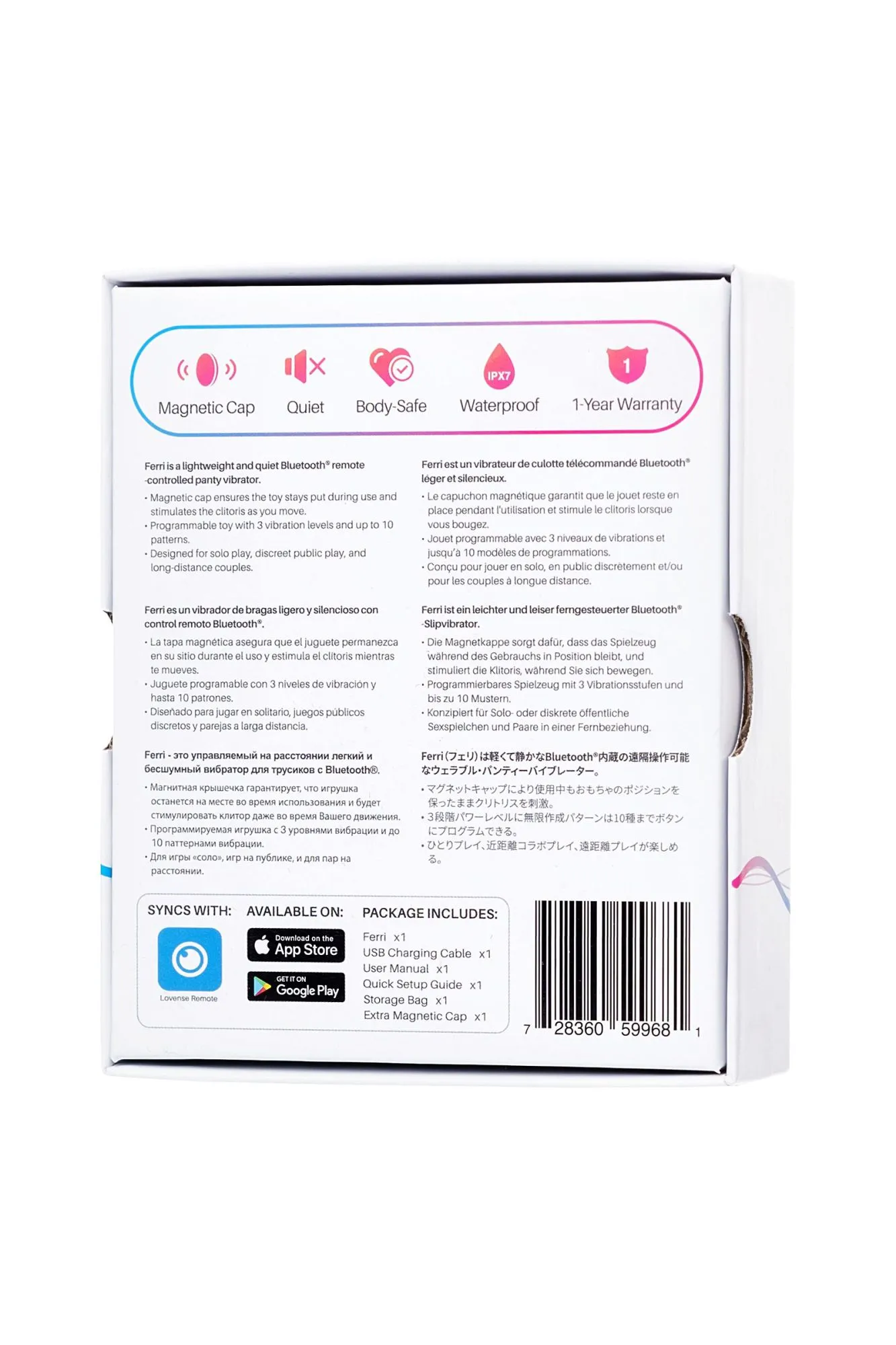 Погрузитесь в мир сексуальных наслаждений с Ferri от Lovense — инновационным вибратором для трусиков с магнитным зажимом, который стимулирует клитор и управляется на расстоянии. Эта носимая игрушка не вставляется, но остается на месте и идеально подходит для комфортного и длительного использования. Ferri придаст перчинку всему, что вы будете делать. К концу дня вы прочувствуете все вибрации, с которыми только сможете справиться… и промокшие трусики. Его сильные вибрации и стабильное подсоединение обеспечат незабываемое времяпрепровождение во время скрытой игры в публичном месте. Благодаря компактным размерам, кстати его вес всего 35 грамм, Ferri легко носить в любом месте и наслаждаться его мощными возможностями. Стильный и эргономичный дизайн Ferri прекрасно вписывается в вашу анатомию, обеспечивая комфорт и наслаждение. Изогнутый корпус игрушки создан для массажа половых губ, а кончик в форме язычка подарит вариант более нацеленной стимуляции. Независимо от того, где вы находитесь — на прогулке, на танцполе, в такси, на кухне или даже за ужином в ресторане — Ferri добавит изюминку в вашу обычную рутину. Ferri неважно какие на вас трусики. Надежный магнитный зажим позволяет Ferri оставаться на месте, обеспечивая стимуляцию клитора даже при движении. Будьте уверены, что ваше удовольствие будет постоянным и интенсивным, независимо от ситуации. Ferri имеет разнообразные режимы вибрации, которые можно настроить через приложение Lovense Remote. Выбирайте подходящий уровень интенсивности и настроить паттерны вибрации по своему вкусу. Делитесь своими уникальными сексуальными сценариями или выберите из более чем 10000 бесплатных паттернов в нашей библиотеке. Благодаря теледилдонической технологии Lovense вы и ваш партнер можете чувствовать себя рядом, где бы вы ни находились. Для любви нет расстояния – с управлением на близком расстоянии вы можете наслаждаться интимными моментами с партнером, в то время как дистанционное управление позволяет наслаждаться им на далеком расстоянии. Приложение Lovense Remote является мобильным приложением для удаленного управления секс-игрушками, позволяя синхронизировать их с музыкой и активировать вибрации звуками. Кроме того, теперь вы можете просыпаться от наслаждения, а не от звона будильника. Ferri разбудит вас, лаская вашу эрогенную зону. Это отличный способ начать день! Все, что вам нужно сделать - это зайти в приложение и установить время. Ferri обладает высоким уровнем безопасности и комфорта. Изготовленный из 100% высококачественного силикона, он доставит вам удовольствие безопасно для вашего тела. Кроме того, Ferri водонепроницаем (IPX7) и легко моется, что делает его идеальным компаньоном для использования в ванне или душе. Неограниченные возможности, стильный дизайн, надежность и мощные вибрации — все это делает Ferri от Lovense идеальным выбором для тех, кто ищет новые пути наслаждения и страстных приключений. Ferri станет идеальным подарком как в дополнение к любой коллекции секс-игрушек, так и в качестве первой игрушки. 3 уровня мощности 10 паттернов вибрации Водонепроницаемость IPX7 Магнитный зарядный порт, USB зарядка Управление на расстоянии Время работы до 195 минут, время зарядки 1 час В режиме ожидания до 100 часов Что в комплекте: Вибратор для трусиков с управлением на расстоянии Ferri с Bluetooth USB Кабель для подзарядки Руководство 