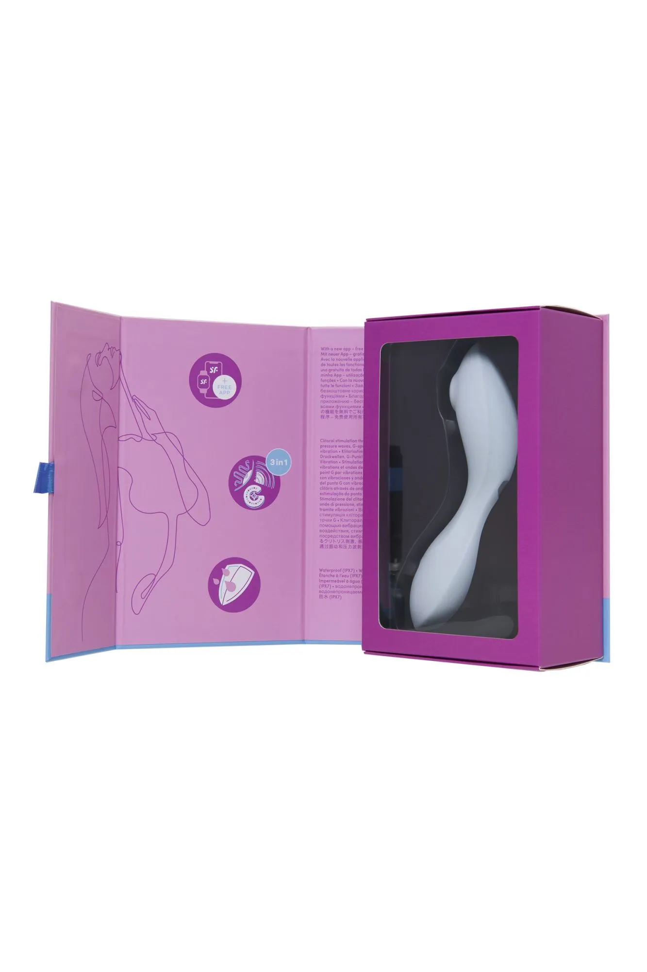 Инновационный вибратор 3 в 1 Curvy Trinity 5+ от Satisfyer создан дарить максимальное удовольствие. Этот вибрирующий и пульсирующий любовник с тройным эффектом станет вашим любимым приобретением. Многофункциональный красавчик сочетает в себе наружную стимуляцию клитора воздушными волнами и вибрацией, внешнюю стимуляцию эрогенных зон и внутреннее воздействие на зону G проникающими виброволнами. С одной стороны стимулятора имеется раструб, который балует вашу жемчужинку воздушной пульсацией, превосходящей любые оральные ласки. Бесконтактная стимуляция клитора – новейшая запатентованная технология Air Pulse для женских оргазмов будет сводить вас с ума снова и снова. А в сочетании с проникающей вибрацией Curvy Trinity 5+ дарит клитору умопомрачительные ощущения, меняющие представление об оргазмах. С другой стороны гладкий сужающийся ствол, идеально подходящий для прицельного массажа точки G. Длина погружной части 8 см, диаметр 3,7 см. Благодаря изогнутой форме Curvy Trinity 5+ также можно использовать в качестве вибратора для наружных эрогенных зон. Дополнительный ребристый рельеф сделает проникновение более пикантным. Curvy Trinity 5+ обладает двумя автономными моторами. Комбинируйте воздушную пульсацию и проникающие волны вибрации, чтобы достигать неземного блаженства каждый раз. В вашем распоряжении 11 уровней интенсивности вакуум-волновой стимуляции и 12 программ вибрации – от нежной до интенсивной. Интуитивно понятное управление с помощью трех кнопок на корпусе. Испытайте удовольствие по-настоящему с бесплатной функцией управление при помощи смартфона с поддержкой Bluetooth через приложение Satisfyer Connect, доступное на Android и iOS. Создавайте собственные уникальные режимы вибрации, существенно расширив возможности предустановленных режимов. Девайс способен вибрировать даже в такт музыке. Satisfyer Connect не имеет границ – передавайте управление удовольствием партнеру даже на большом расстоянии. Благодаря нежному материалу, из которого выполнен Curvy Trinity 5+, вам будет комфортно и приятно держать его в руках и получать удовольствие от его вибрации и пульсации. Высококачественный шелковистый на ощупь гипоаллергенный силикон – визитная карточка бренда Satisfyer. Поверхность раструба мягко и деликатно стимулирует клиторальную область, тактильно нежный и приятный на ощупь, силикон быстро адаптируется к температуре вашего тела. Чтобы получить максимум удовольствия и сохранить материал в наилучшем виде, рекомендуется пользоваться качественной смазкой на водной основе. После использования обязательно очищайте игрушку теплой водой со специальными бактерицидными спреями для интимных товаров. Особенности: Возможность одновременного воздействия на клитор воздушной пульсацией и вибрацией. Изогнутая форма и мощные проникающие вибрации для зоны G. Простое управление отдельными моторами двумя кнопками. 12 режимов вибрации и 11 режимов волновой стимуляции. Неограниченные возможности управления через приложение Satisfyer Connect. Нежный голубой цвет и мягкий, эластичный силикон без запаха, без аллергенов и вредных для здоровья веществ. 100% водонепроницаемый - IPX7. Время работы 60 минут. Перезаряжаемый, магнитный USB-кабель, время зарядки 2,5 часа.
