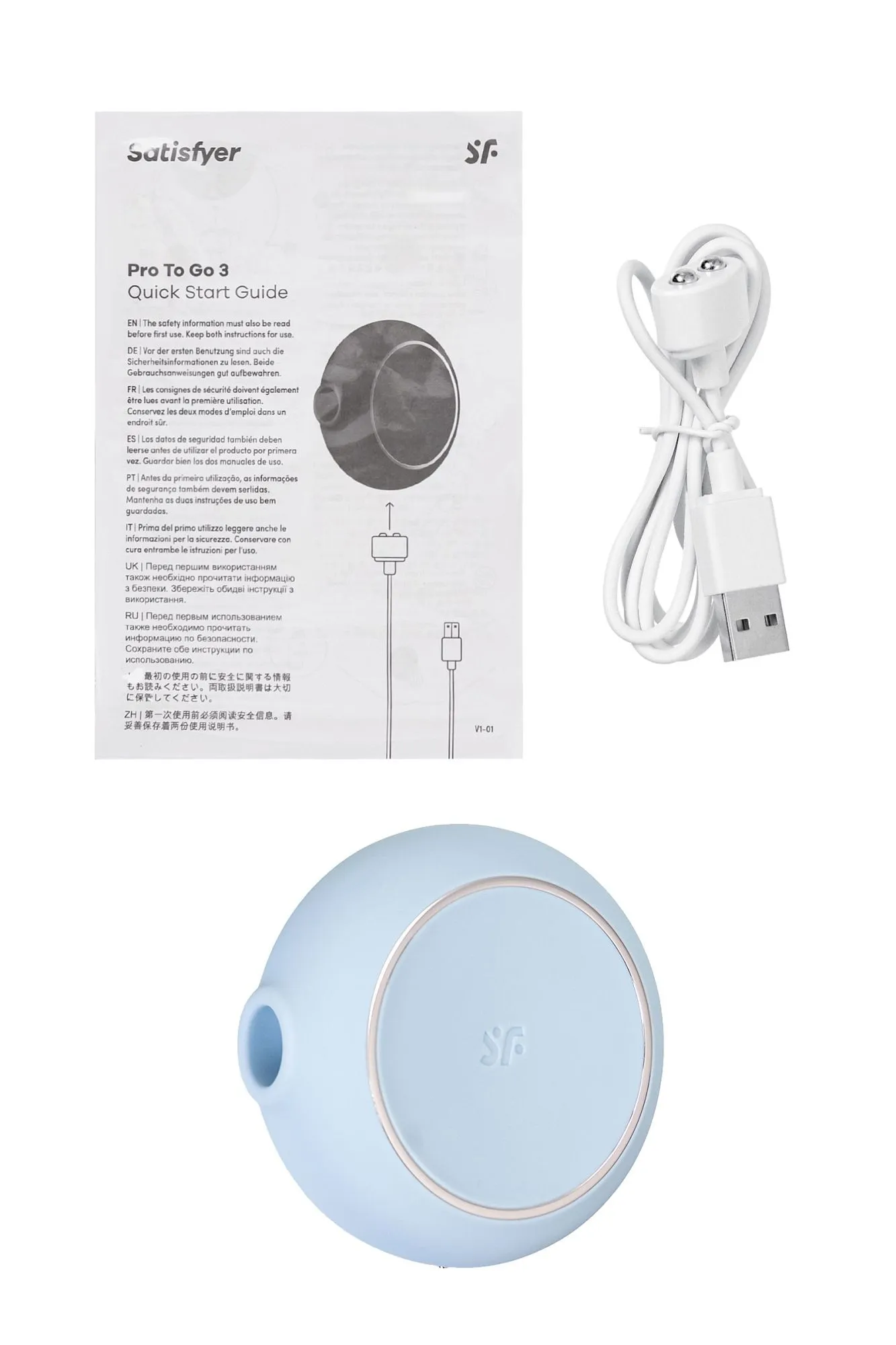 Один из самых стильных любовников для чувственных оргазмов – Pro To Go 3 от Satisfyer в нежно голубом цвете и дизайне, далеком от классических интимных игрушек. Компактный вибратор для наружной стимуляции клитора обладает двумя автономными моторами. Комбинируйте воздушную пульсацию и проникающие волны вибрации, чтобы достигать неземного блаженства каждый раз. Бесконтактная стимуляция клитора – новейшая запатентованная технология Air Pulse для женских оргазмов. В вашем распоряжении 11 уровней интенсивности вакуум-волновой стимуляции и 12 программ вибрации – от нежной до интенсивной. Интуитивно понятное управление с помощью трех кнопок на корпусе. Стильный дизайн Pro To Go 3 напоминает компактную пудреницу или гаджет для красоты, и превосходно лежит в ладони. При этом вибрация в корпусе значительно менее ощутима, чем в основной контактной части. Идеальный размер и форма, чтобы брать любимый стимулятор в дорогу. Стильный и качественный гаджет создан для эстетического и сексуального удовольствия. Потрясающий шелковистый на ощупь высококачественный гипоаллергенный силикон – визитная карточка бренда Satisfyer. Поверхность раструба мягко и деликатно стимулирует клиторальную область. Тактильно нежный и приятный на ощупь силикон быстро адаптируется к температуре вашего тела. Чтобы получить максимум удовольствия и сохранить материал в наилучшем виде, рекомендуется пользоваться качественной смазкой на водной основе. После использования обязательно очищайте вибратор теплой водой со специальными бактерицидными спреями для интимных товаров. Благодаря водонепроницаемости дарить себе удовольствие можно даже принимая ванну или душ. Особенности: Возможность одновременного воздействия на клитор воздушной пульсацией и вибрацией Управление кнопками на корпусе. 12 режимов вибрации и 11 режимов волновой стимуляции. Нежный голубой цвет и мягкий, эластичный силикон без запаха, без аллергенов и вредных для здоровья веществ. 100% водонепроницаемый - IPX7. Перезаряжаемый, USB-кабель.