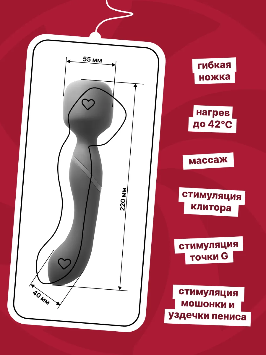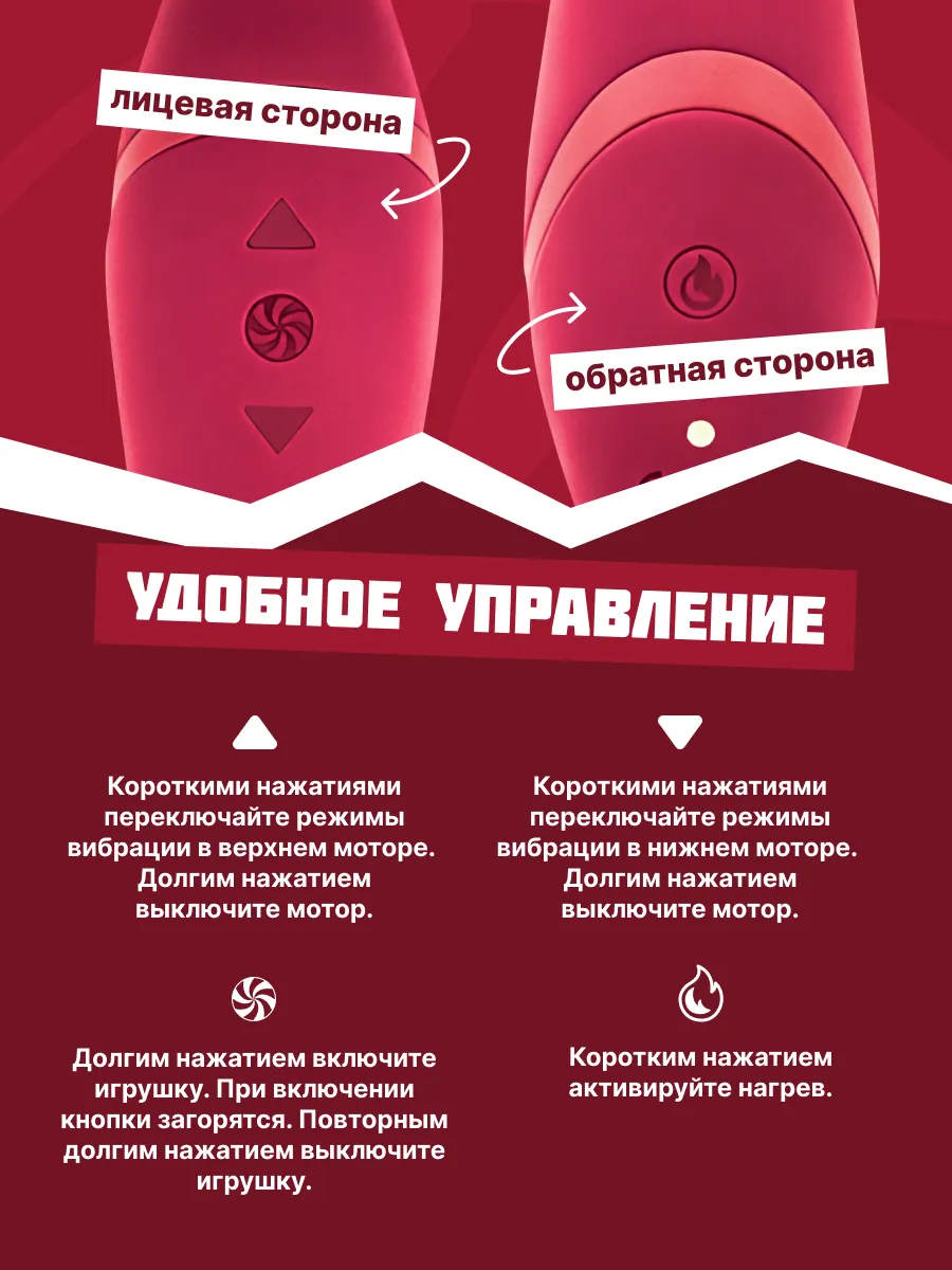 Двусторонний вонд изготовлен из гипоаллергенного силикона и полностью водонепроницаем. Два мощных перезаряжаемых мотора имеют по 10 режимов глубокой вибрации, а подвижная головка способна нагреваться до 42 градусов за 5 минут. Игрушка оснащена индикатором уровня заряда батареи - кнопки подсвечиваются, когда заряд достигает отметки в 15%. Подходит для массажа, а также эффективно простимулирует клитор и любые внешние эрогенные зоны. Проникающая часть идеальна для вагинальной и анальной стимуляции. Для включения удерживайте кнопку карамельки на передней панели игрушки 3 секунды. Когда игрушка включена, кнопки светятся. Стрелка наверх отвечает за мотор головки, стрелка вниз - за мотор проникающей части. Легкое нажатие стрелок переключает режимы вибрации. Кнопка нагрева в виде огонька расположена на задней стороне игрушки. Удержание в течении 3 секунд данной кнопки включает режим нагрева. Время зарядки: 180 мин. Время работы: 1 мотор - 95 мин, 1 мотор + нагрев, 2 мотора - 75 мин, 2 мотора + нагрев - 50 мин.