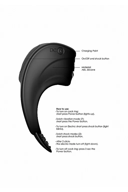 Cock Ring - C-spot Massager – эрекционное кольцо, которое имеет 2 независимых настройки - вибрацию и электростимуляцию, которые можно также использовать одновременно. Вибрация имеет 7 режимов, скорость вращения в нем составляет до 8500 об/мин, а уровень шума - ниже 60 дБ. Режим электростимуляции имеет 2 уровня интенсивности - низкий и высокий. В режиме электростимуляции когда обе металлические полоски будут касаться кожи, будет происходить стимуляция клитора. Язычок с точкой внизу кольца также стимулирует промежность.