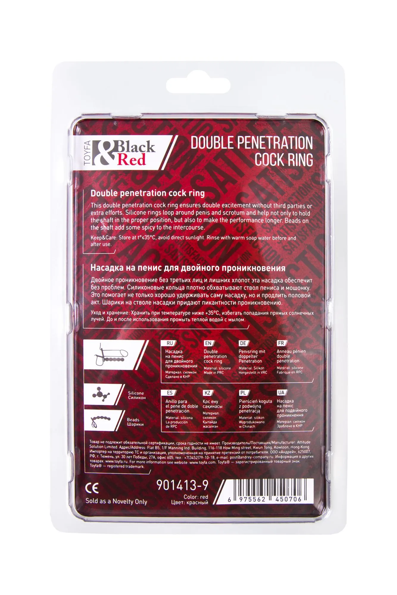 Насадка на пенис для двойного проникновения Black&Red by TOYFA, силикон, красная, 19,5 см