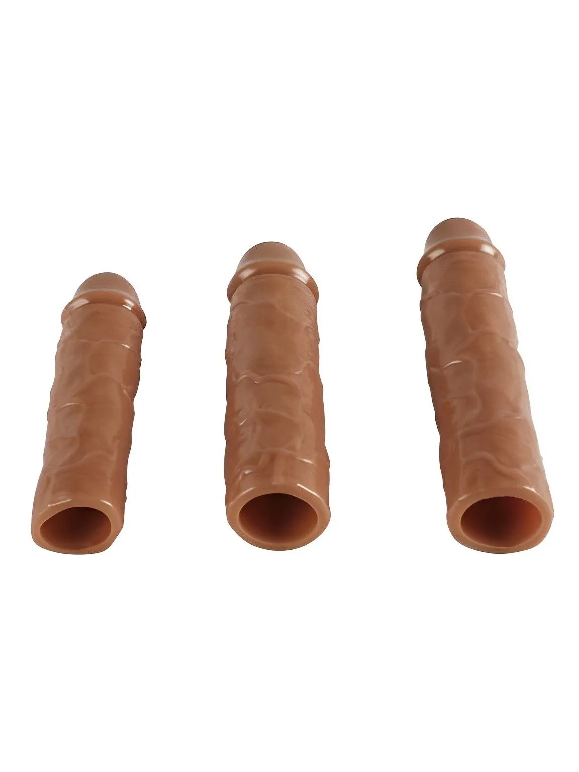 Набор насадок закрытого типа для увеличения длины и обхвата полового члена, а так же осуществления дополнительного воздействия. Насадки обладают сглаженной рельефной текстурой с ярко выраженной головкой для дополнительной более мягкой стимуляции. Они очень эластичные и хорошо растягиваются. Насадки надевается на всю длину полового члена. Для идеальной посадки лишний материал можно отрезать.