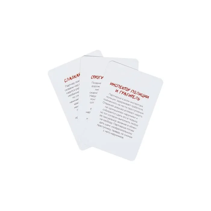 Игра-бомба, игра-хит, игра, которую разбирают быстрее, чем горячие пирожки. Романтично-эротическая игра состоит из 30 карточек-сценариев, плюс наручники в каждой коробке. Девушкам нравится, парни в восторге. Не важно, чего тебе хочется больше - доминировать или подчиняться - получай максимальное удовольствие от процесса и наслаждайся своей новой ролью. Главное, во всех случаях применения наручников соблюдай меры безопасности и не допускай возникновения дискомфортных ощущений.