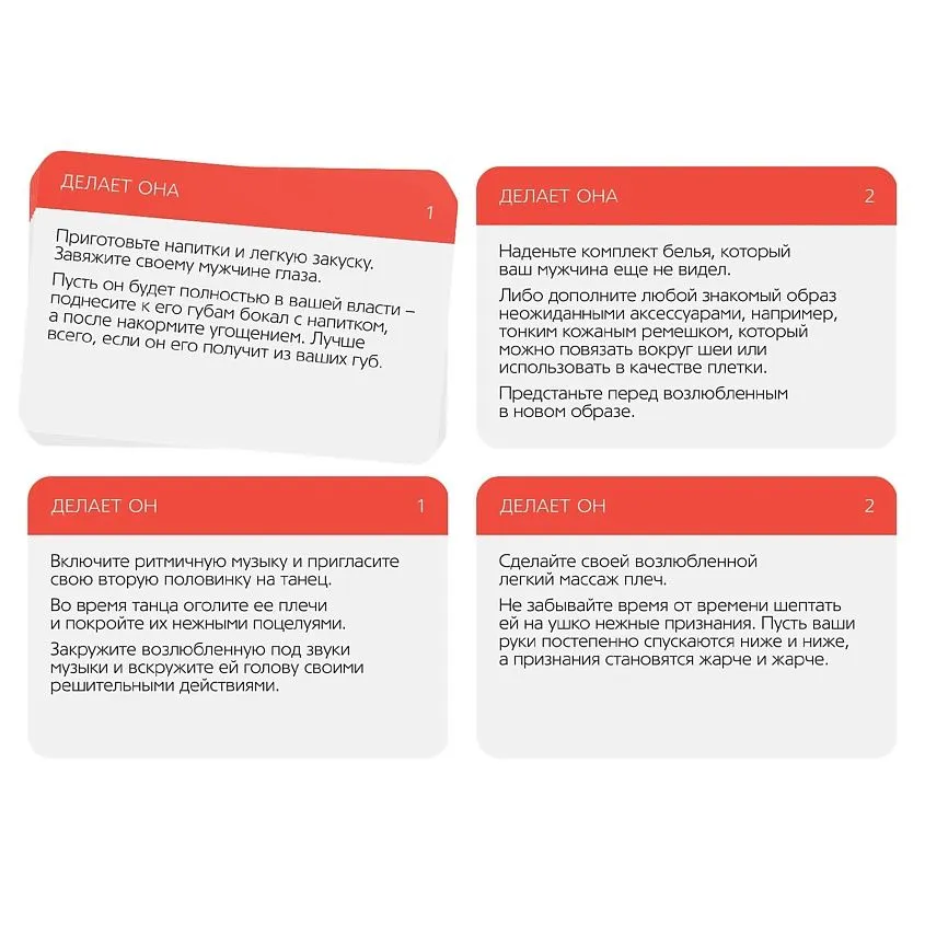 Этот набор позволит вам разнообразить сексуальную жизнь и добавить в неё немного перчинки. Вас ждут чулки в сеточку, кружевная маска, пёрышко, а также 5 карт с возбуждающими заданиями, которые нужно выполнять по очереди. Что с этим делать? Да всё, что угодно. Главное, чтобы это принесло вам удовольствие!