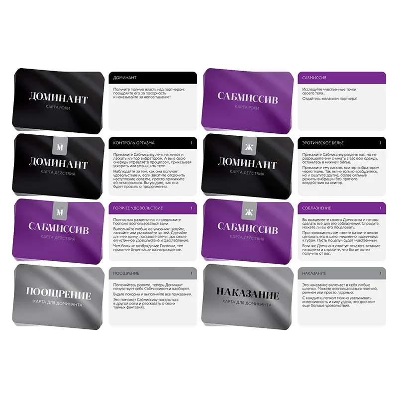 Выберите карту с ролевым сюжетом или доверьтесь случайности, разыграв любой сценарий. Если выполненное задание удовлетворило доминанта, сабмиссив получает поощрение. Если нет — наказание. Не забудьте добавить в игру перчинки с помощью вибратора, анальной втулки и виброкольца.