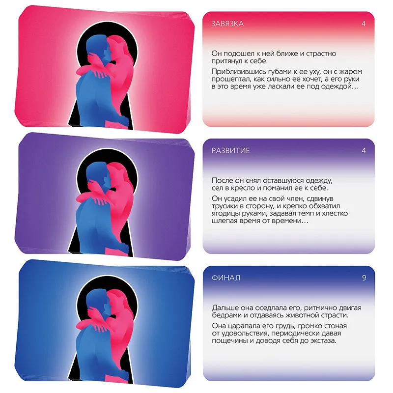 Что делать? Разделите карты на три колоды: «Завязка», «Развитие» и «Финал». Вытягивайте по одной карте из каждой колоды и соединяйте их по порядку. Вы получите сценарий для вашего секса, и каждый раз он будет новым.