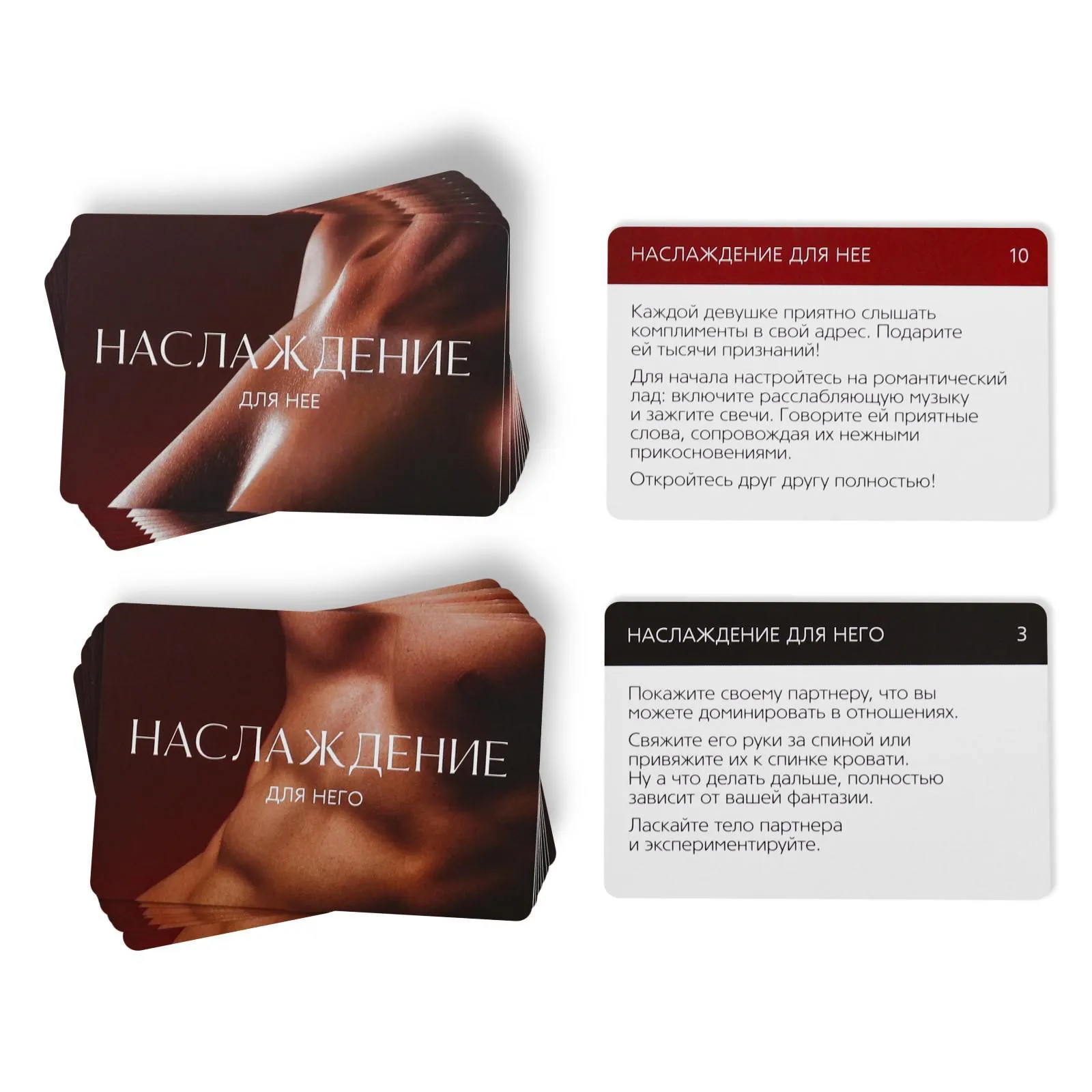 После используйте карточки «Наслаждение для него» и «Наслаждение для нее». По очереди вытягивайте карточки из колоды и вручайте их партнеру. Продолжайте игру, пока не будете готовы к ролевым играм, где один будет доминировать, а другой – подчиняться.