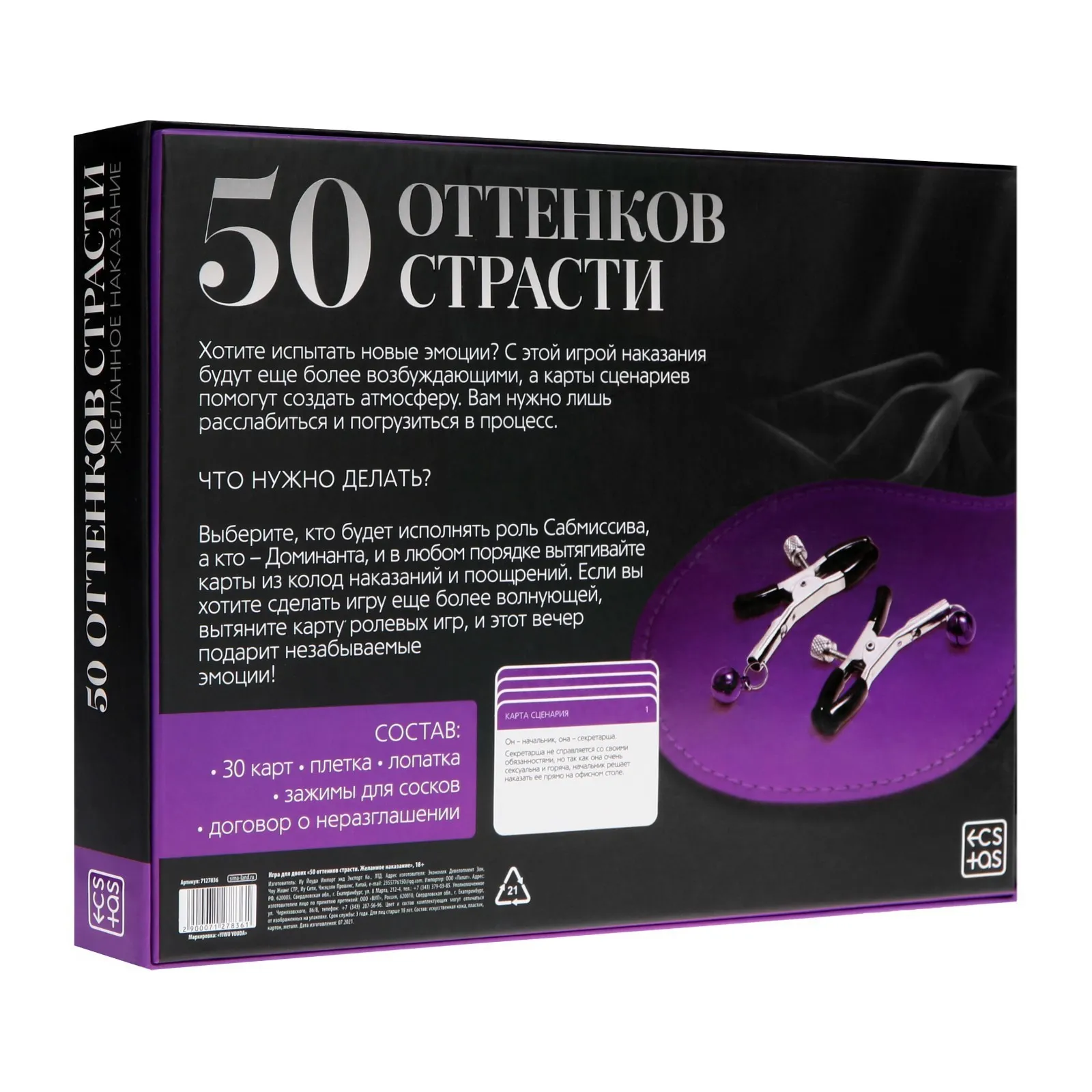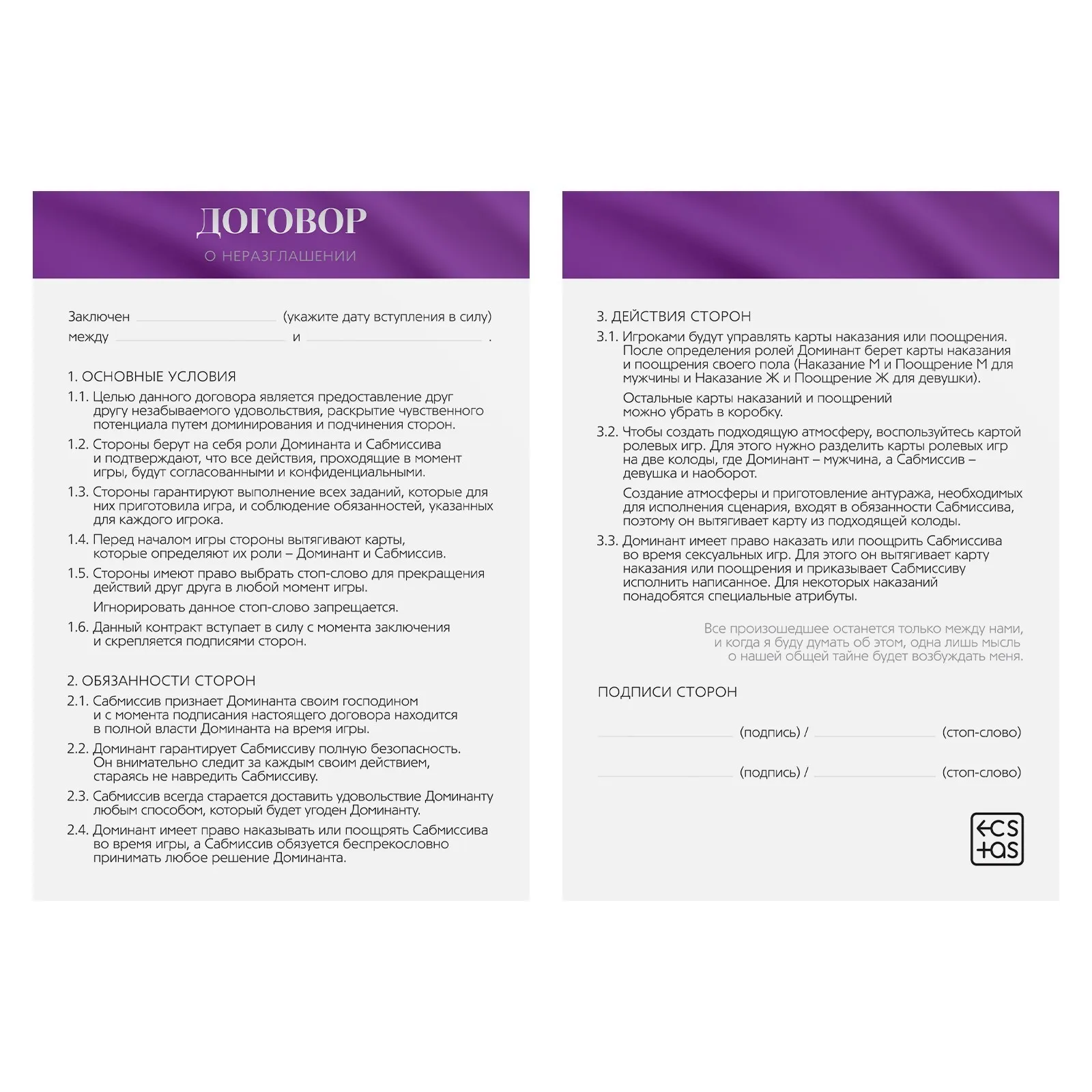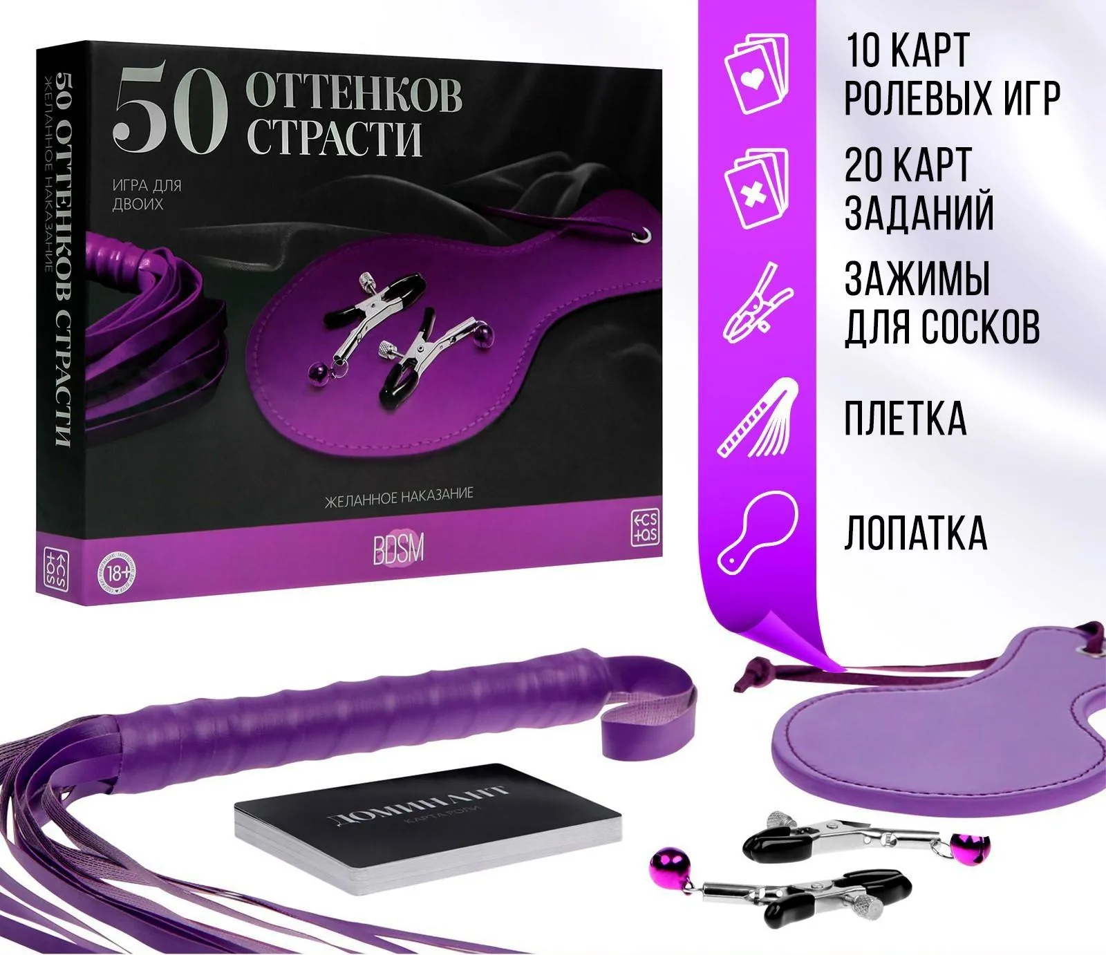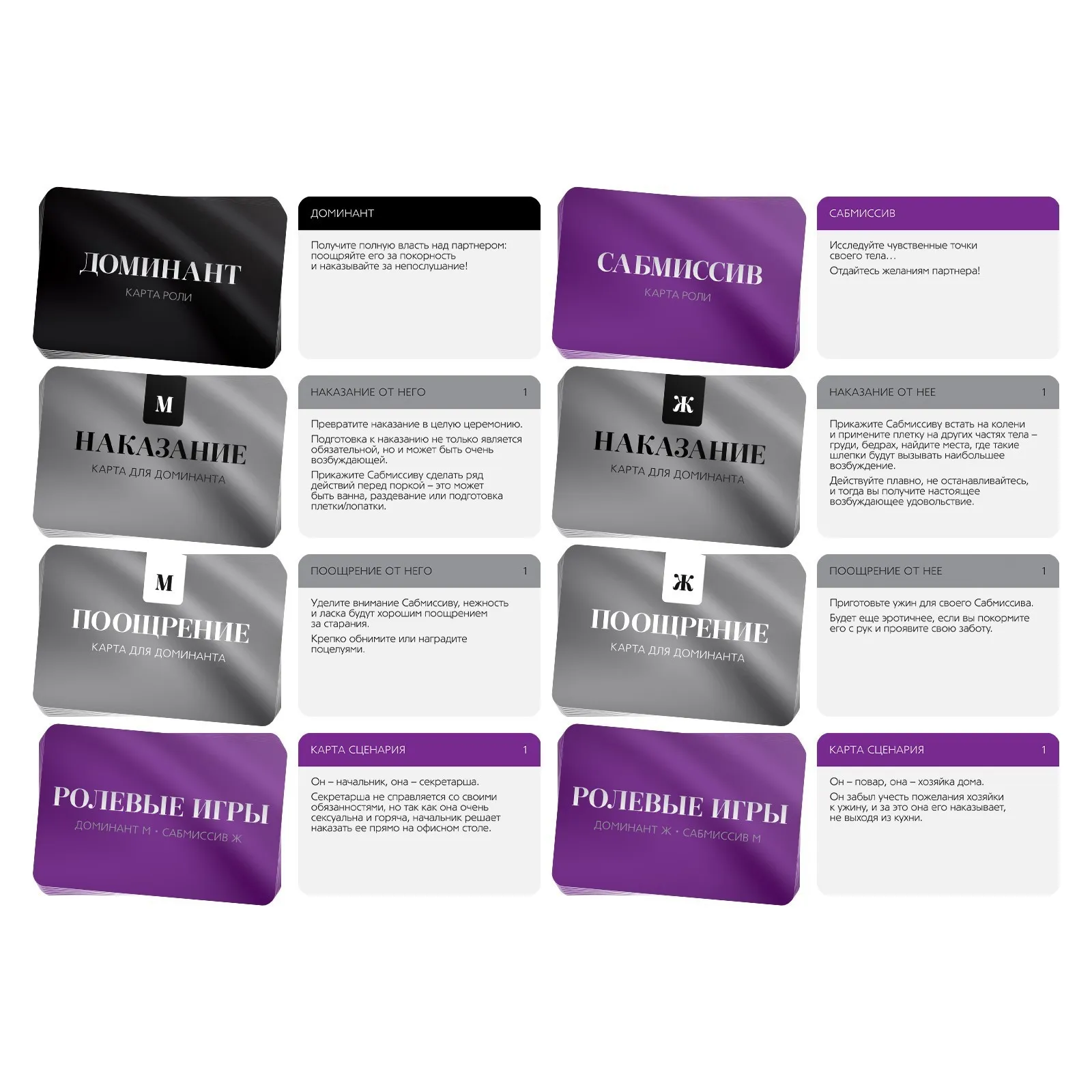 Хотите испытать новые эмоции? С этой игрой наказания будут ещё более возбуждающими, а карты ролей помогут создать приятную атмосферу. Вам нужно лишь расслабиться и полностью погрузиться в процесс. Подпишите договор о неразглашении и выберите желаемую роль. Один из вас будет доминирующим (доминантом), а другой — подчиняющимся (сабмиссивом). Доминирующий в любом порядке вытягивает карты из колод наказания и поощрения. Если вы хотите сделать игру более волнующей, вытяните карту из колоды ролей — и этот вечер подарит незабываемые эмоции. В комплекте есть интригующие аксессуары, которые нужно использовать во время игры.