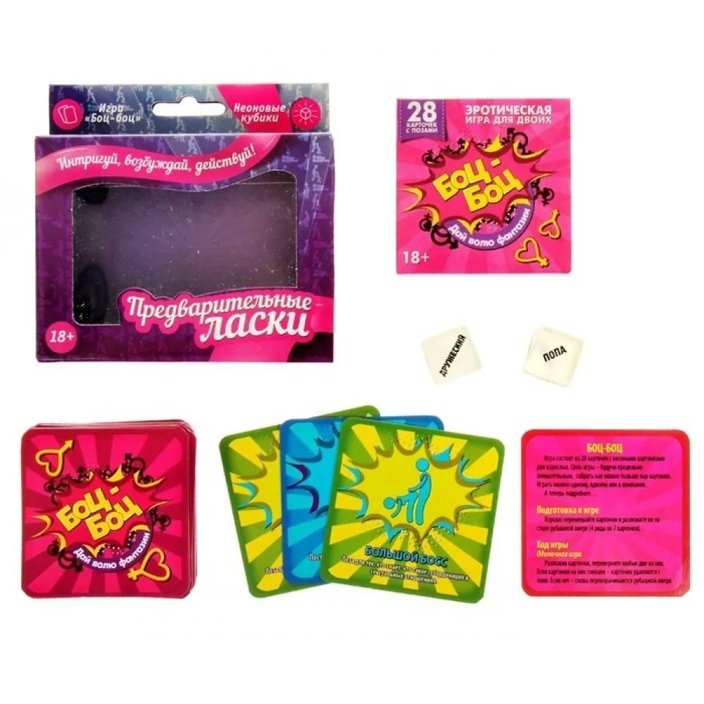 Для начала, чтобы раззадорить чувства, мы предлагаем вам сыграть неоновыми кубиками, каждая грань которого – целое открытие в мире поцелуев. А то, что кубики светятся в темноте, придаст вашей ночи больше огня. А когда вы разогрелись и готовы к более страстным эмоциям, мы предлагаем вам сыграть в игру "Боц-боц". В ней вы найдете 28 карточек с изображением лучших поз для занятий сексом, ищите совпадения и наслаждайтесь друг другом.