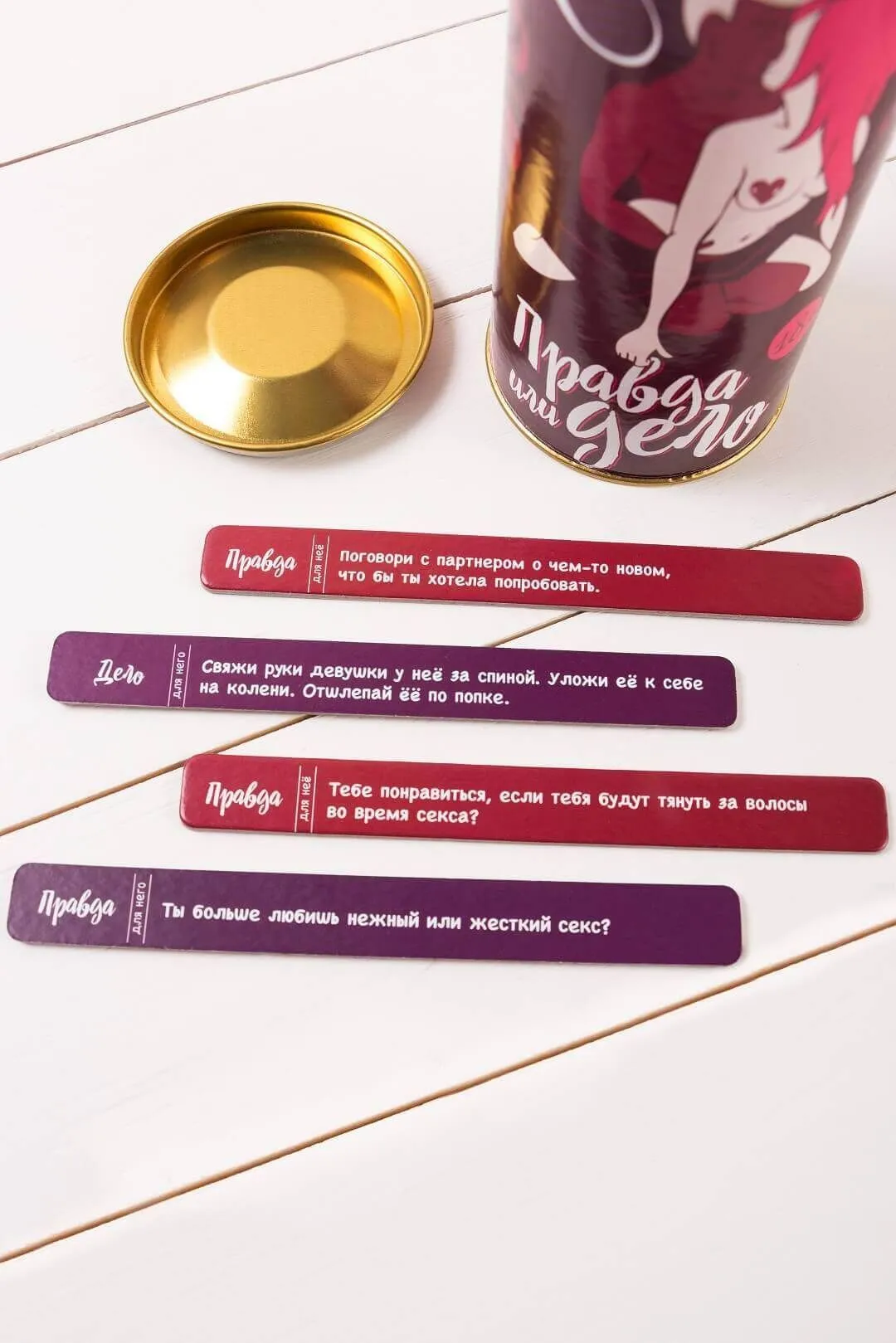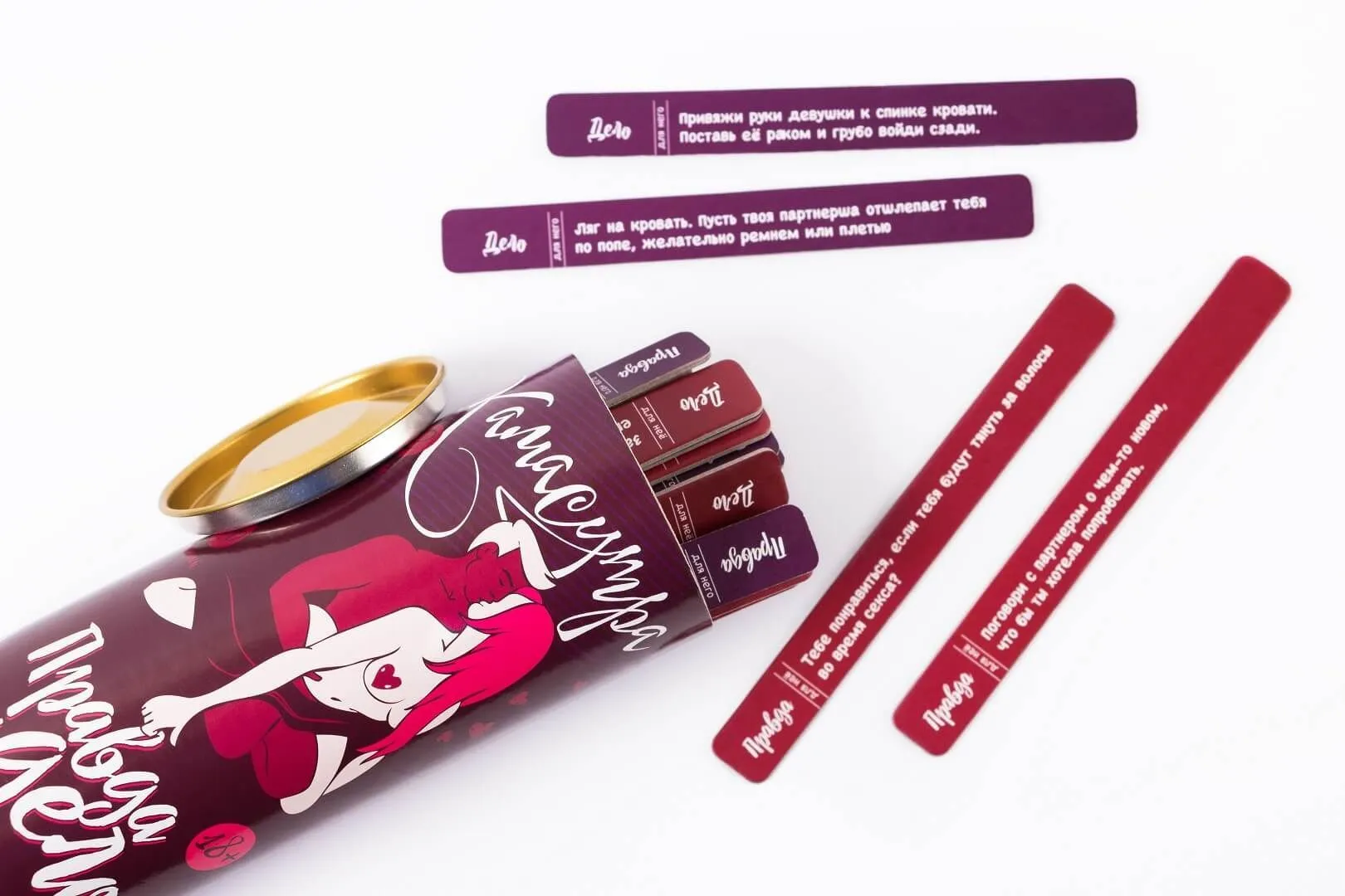 Игра "Правда или дело: Камасутра" от компании Fun Games Shop понравится парам, желающим попробовать что-то новое и узнать друг друга получше. В тубе находится 100 заданий для него и для нее, разделенные на "правду" и "дело". По очереди выполняйте задания или отвечайте на вопросы, чтобы лучше понять желания друг друга и открыться партнеру с новой стороны, рассказывая о своих сексуальных фантазиях. Так как это всего лишь игра, Вы всегда сможете отказаться от выполнения каких-либо заданий, однако устоите ли Вы перед выпавшим шансом попробовать то, что давно хотели?